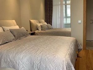 Планировка: просторная комната, в которой предусмотрены двуспальная кровать с ортопедическим матрасом, совмещённый санузел с душевой кабиной, просторный холл с тремя вместительными встроенными шкафами. Квартира полностью меблирована и оснащена всей необходимой бытовой техникой. Предусмотрено много мест для хранения.