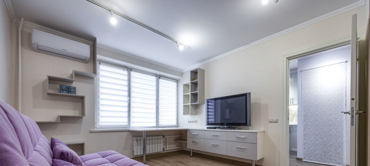 Спальня: Двухспальная кровать с ортопедическим матрасом, шкаф, диван, стол, телевизор, тумба, зоны для хранения.