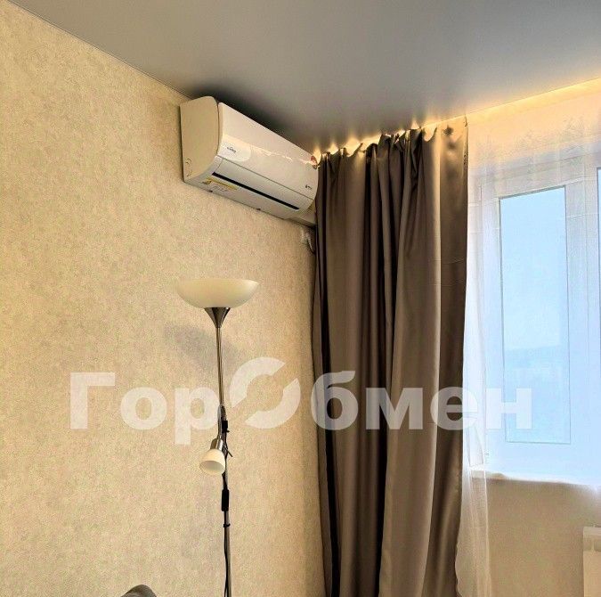 В комнате раскладной диван, шкаф с зеркалом, тумба для ТВ, журнальный столик, торшер. Кондиционер.