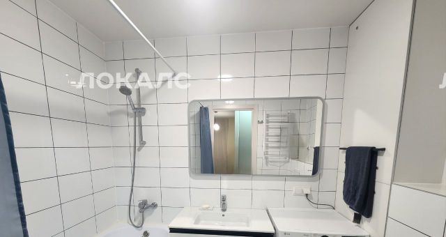 Санузел с полноценной ванной, большой раковиной и зеркалом. Стиральная машина с сушкой. Мягкие полотенца.