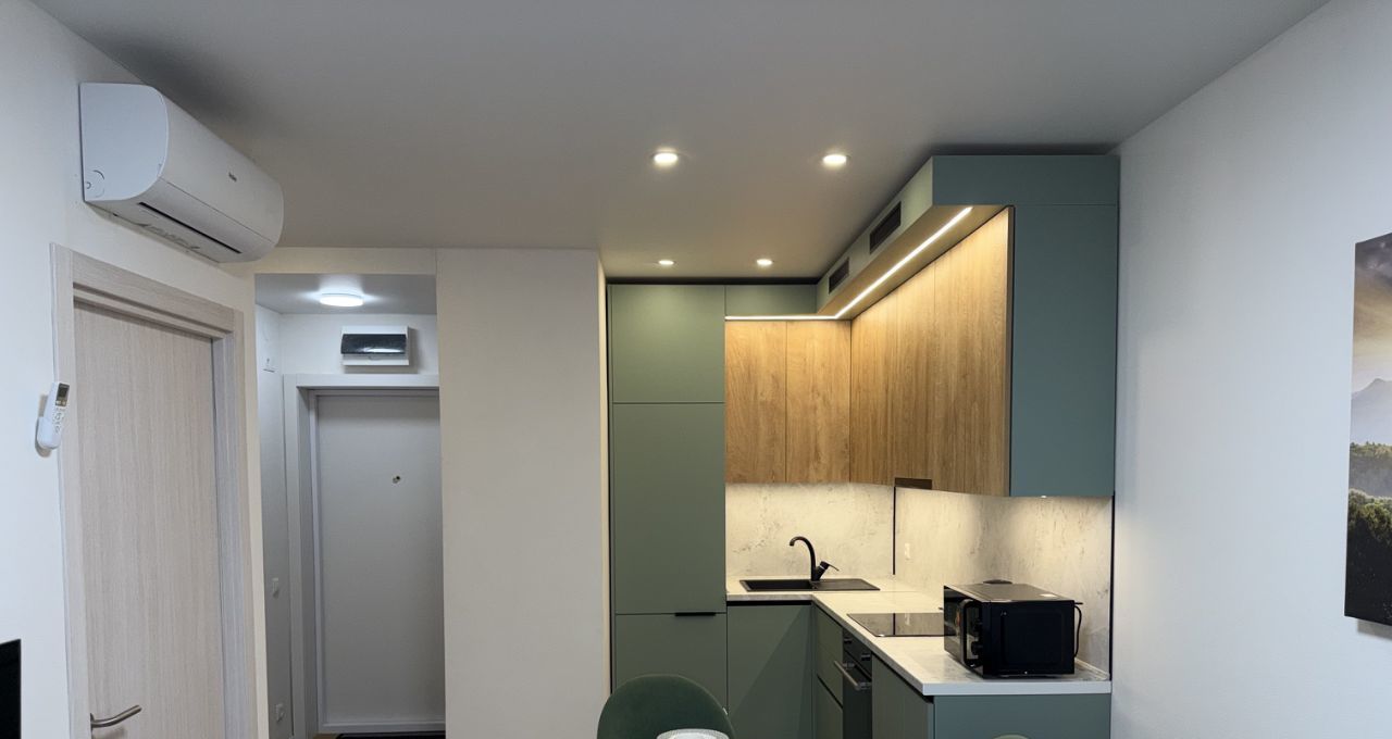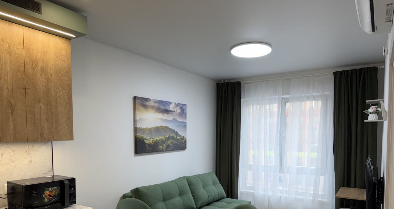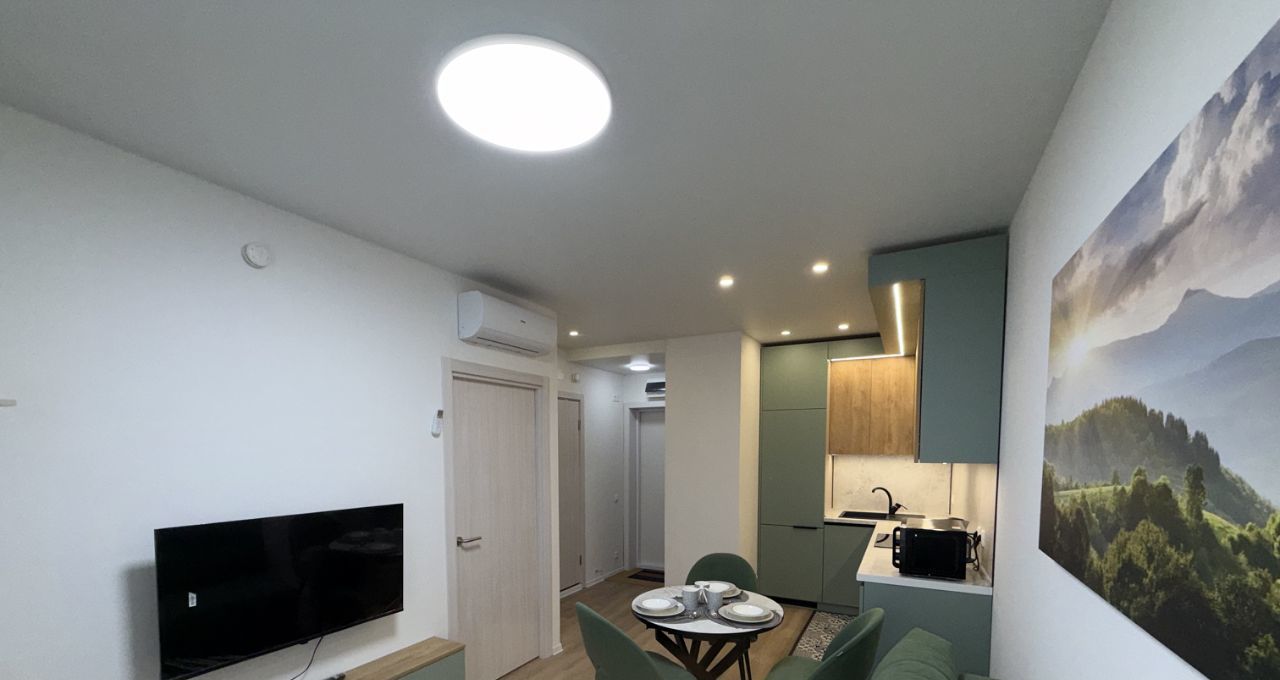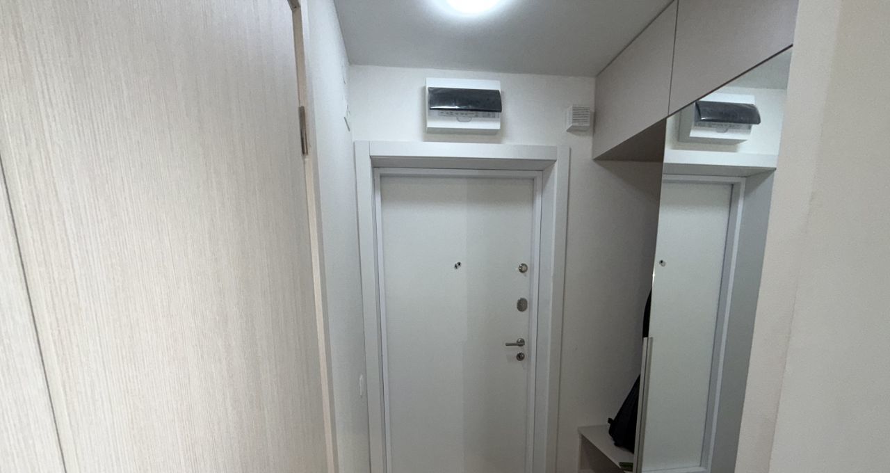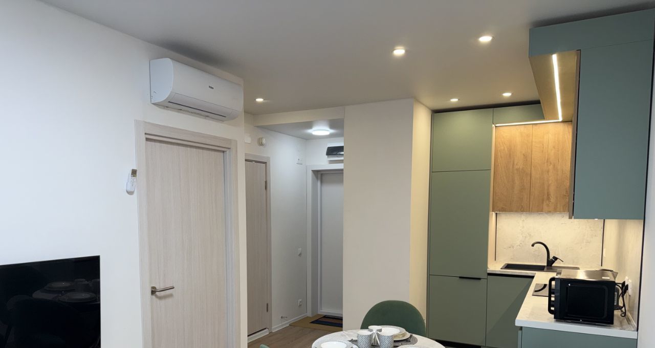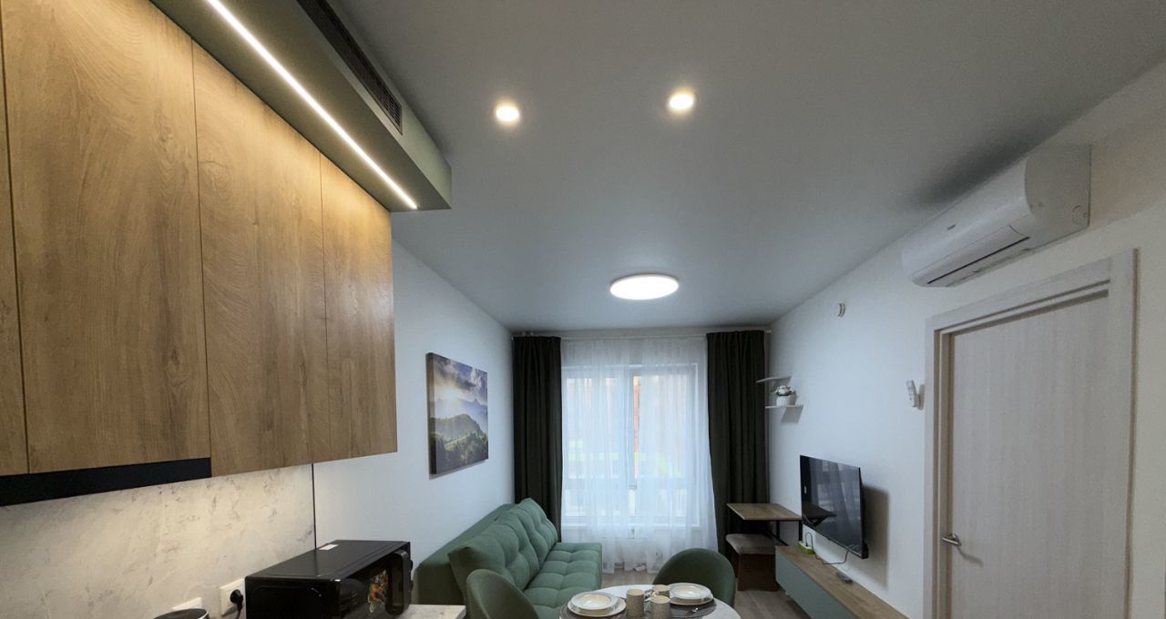 Выполнен качественный ремонт: на полу в кухне-гостиной, спальной комнате, прихожей ламинат, в санузле плитка; большие окна ПВХ с видом во двор, натяжные потолки, большая кухня гостиная 17 кв.метров со всей необходимой встроенной мебелью и техникой (двухкамерный холодильник, индукционная варочная панель, духовой шкаф, вытяжка, кондиционер, телевизор, печь СВЧ, электрочайник, раскладной диван), спальная комната 10 кв.метров (двуспальная кровать, прикроватные тумбочки и двухстворчатый шкаф), просторный совмещенный санузел со стиральной машиной.