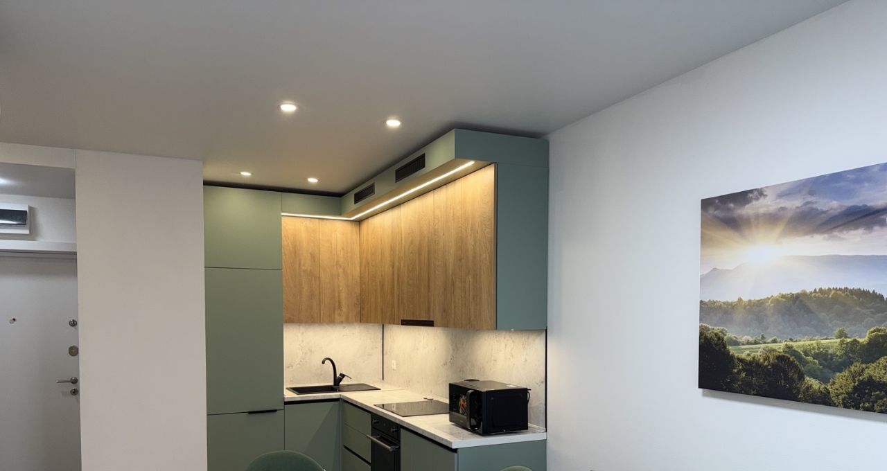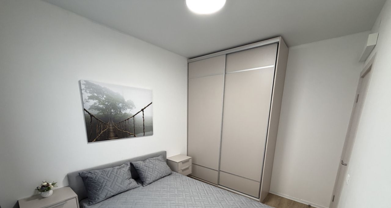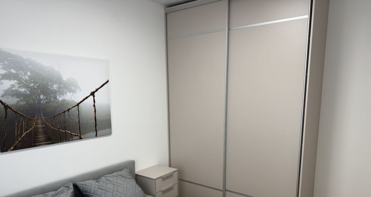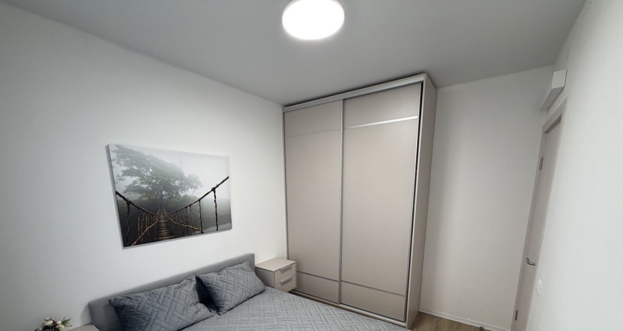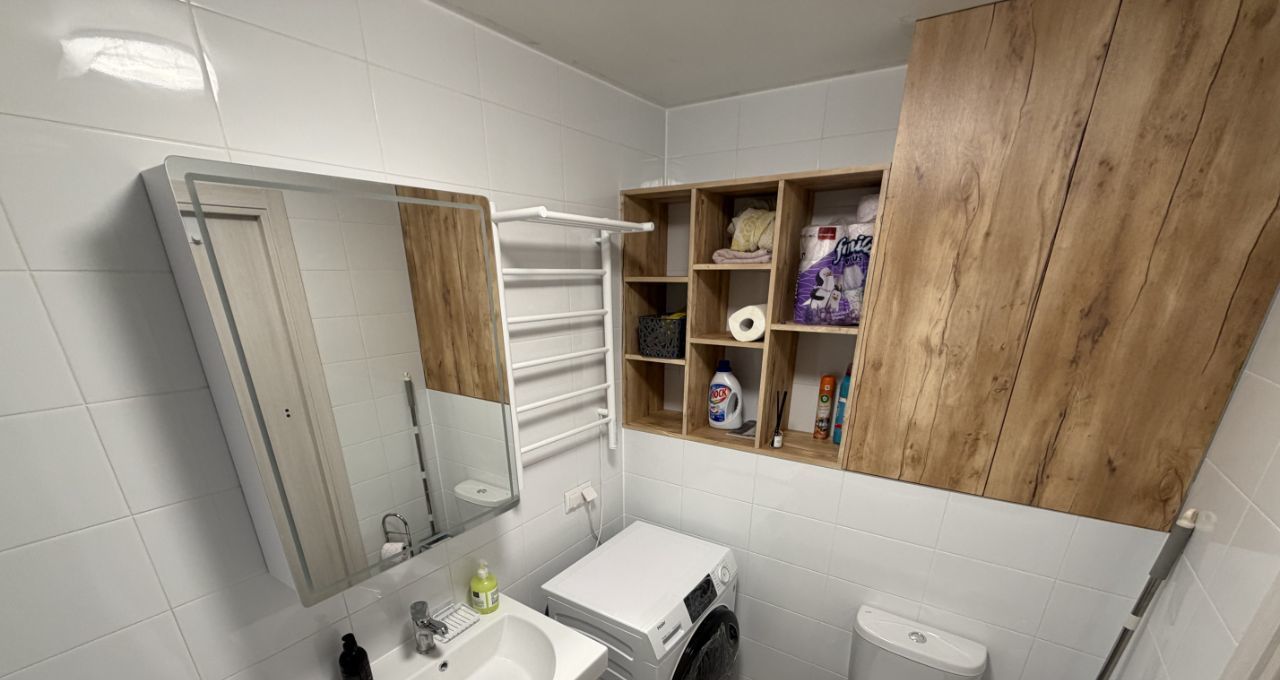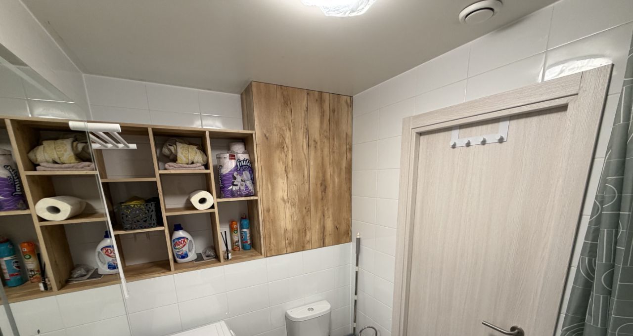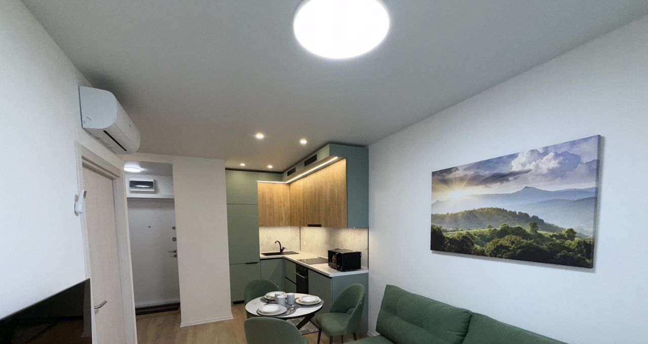 Выполнен качественный ремонт: на полу в кухне-гостиной, спальной комнате, прихожей ламинат, в санузле плитка; большие окна ПВХ с видом во двор, натяжные потолки, большая кухня гостиная 17 кв.метров со всей необходимой встроенной мебелью и техникой (двухкамерный холодильник, индукционная варочная панель, духовой шкаф, вытяжка, кондиционер, телевизор, печь СВЧ, электрочайник, раскладной диван), спальная комната 10 кв.метров (двуспальная кровать, прикроватные тумбочки и двухстворчатый шкаф), просторный совмещенный санузел со стиральной машиной.