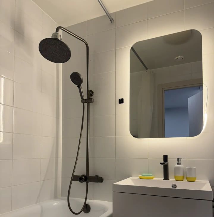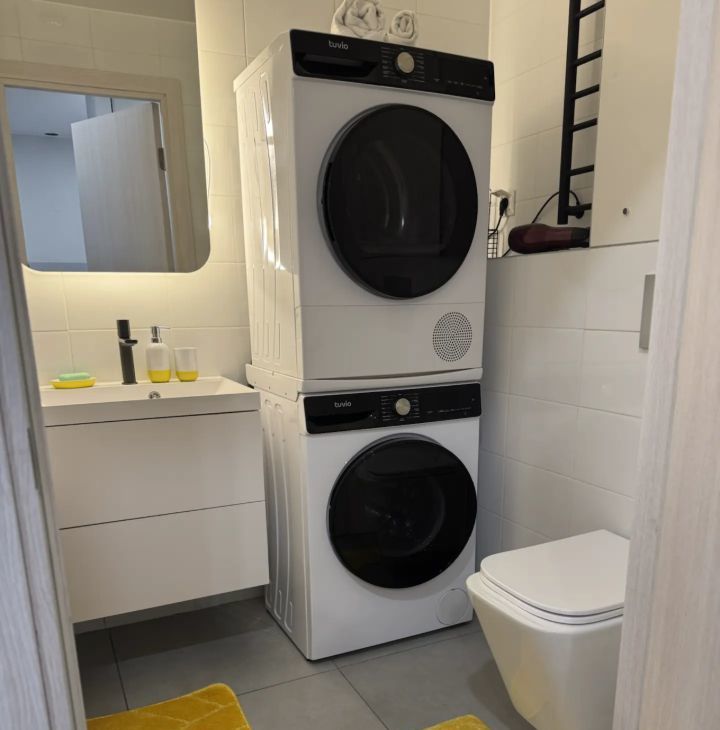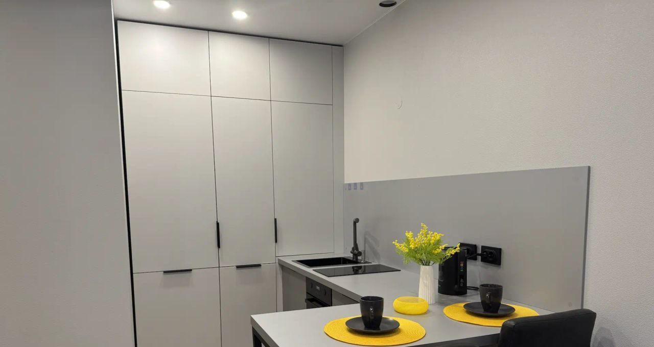 В квартире есть всё необходимое для комфортного проживания. Просторная комната меблирована и оборудована кондиционером. На кухне установлена современная мебель и техника: холодильник, посудомоечная машина, телевизор, стиральная машина, сушильная машина. Санузел совмещённый, с ванной. Интерьер выполнен в светлых тонах, создающих атмосферу уюта и тепла.