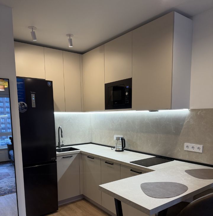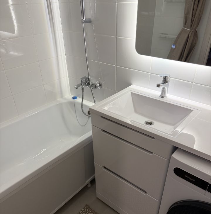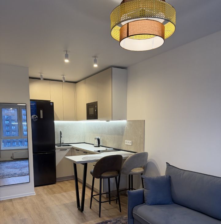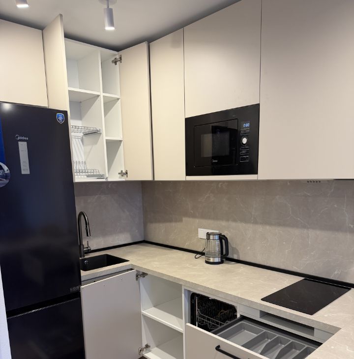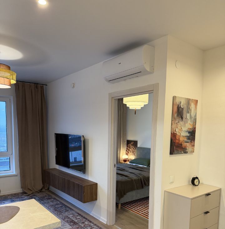 В квартире выполнен современный евроремонт, что создаёт комфортную и стильную обстановку. В комнате и на кухне есть вся необходимая мебель, в том числе удобные шкафы и диван. Кухня оборудована современной техникой: холодильником, посудомоечной машиной, кондиционером и телевизором. В ванной комнате установлена ванна и стиральная машина, что делает быт ещё комфортнее.