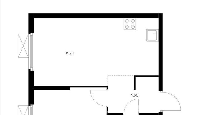 Квартира с просторной кухней-гостиной (19,7 м2) и отдельной небольшой спальней ( 11,3 м2).