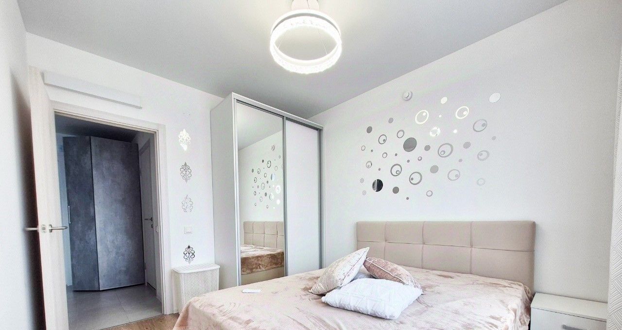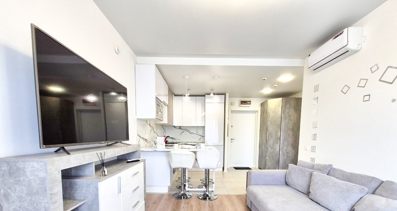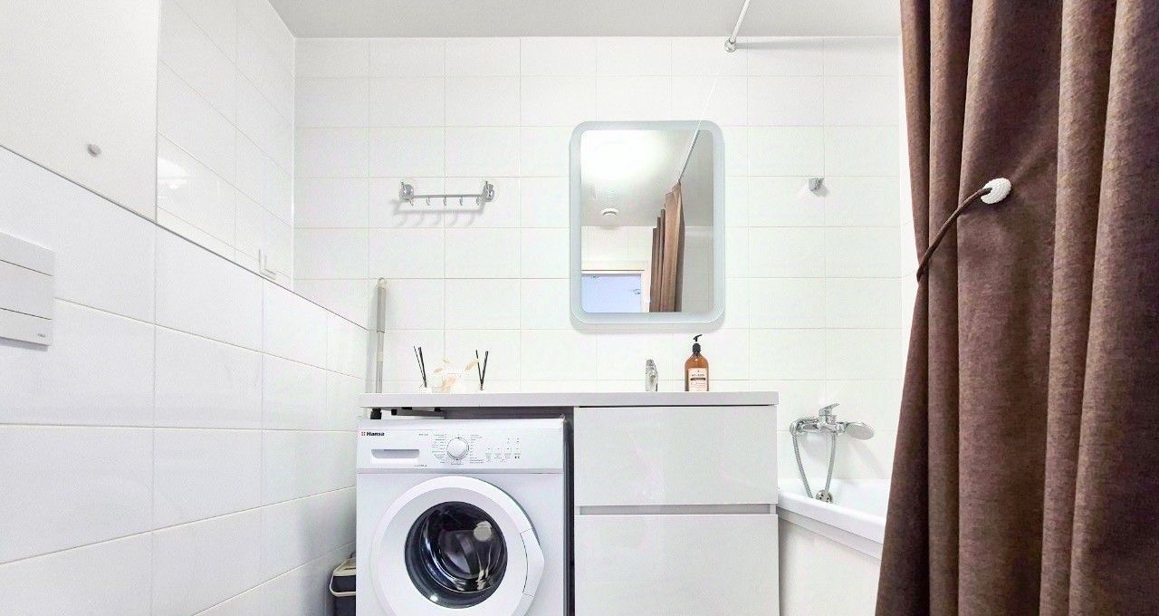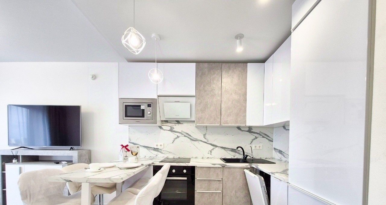 Квартира оснащена вместительным кухонным гарнитуром, мебелью и бытовой техникой: