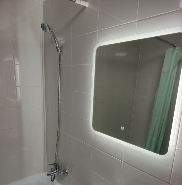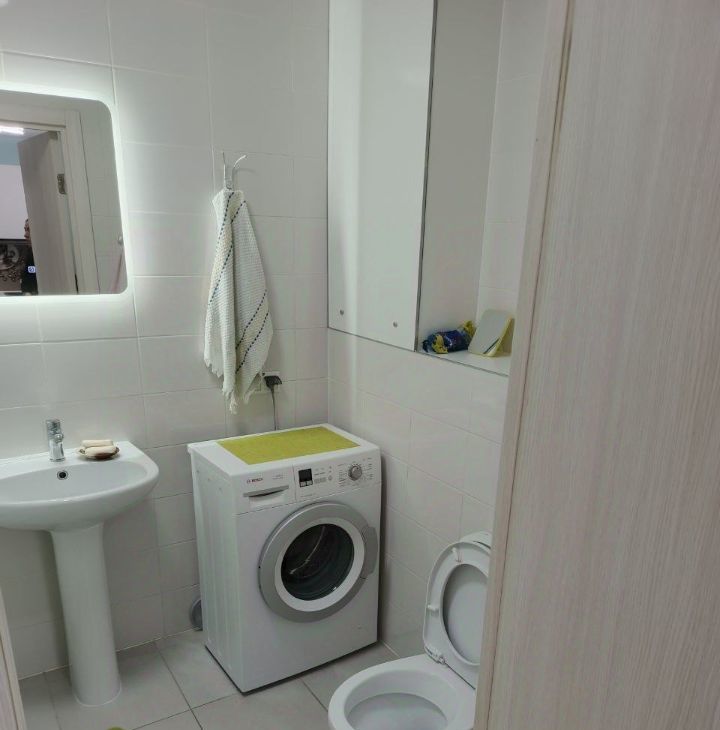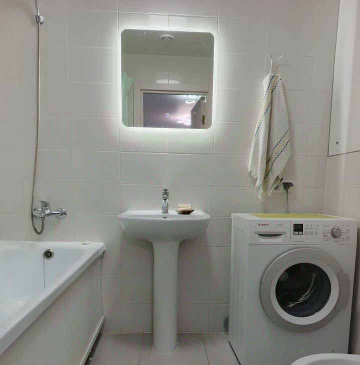 В ванной комнате, есть стиральная машина Бош и зеркало с подсветкой.