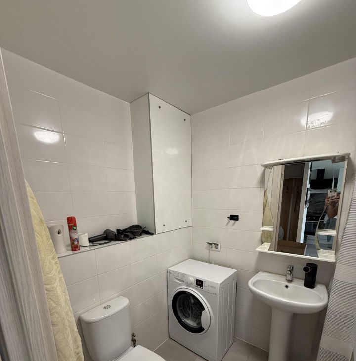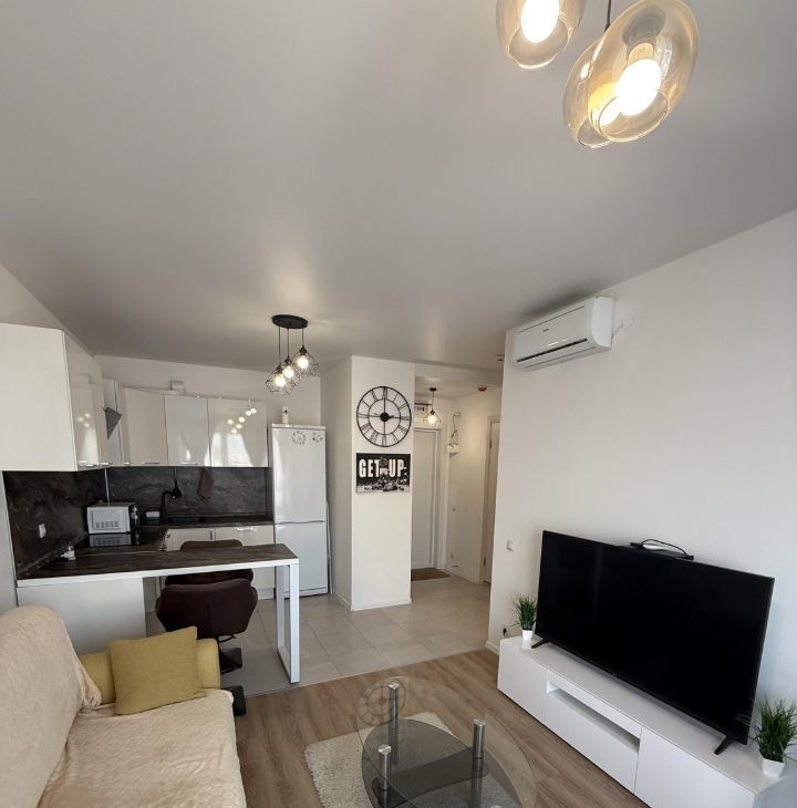 В квартире есть - кондиционер, стиральная машина, холодильник, телевизор, микроволновка, чайник, набор посуды и приборов.