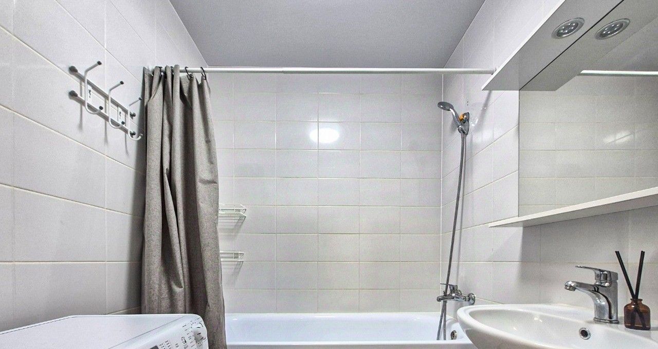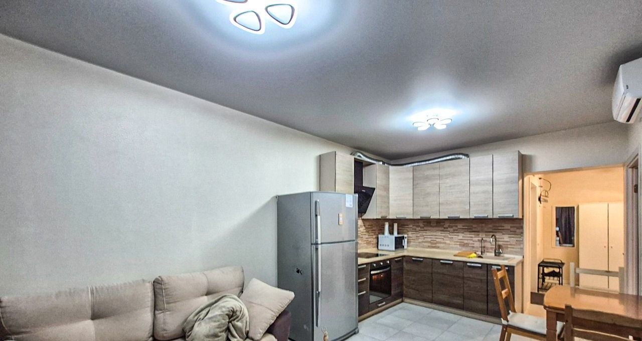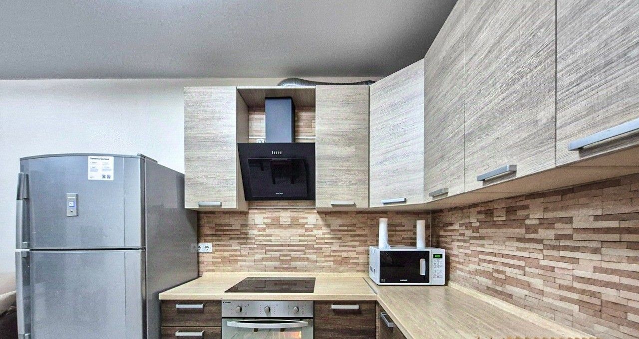 Квартира оснащена вместительным кухонным гарнитуром, мебелью и бытовой техникой: