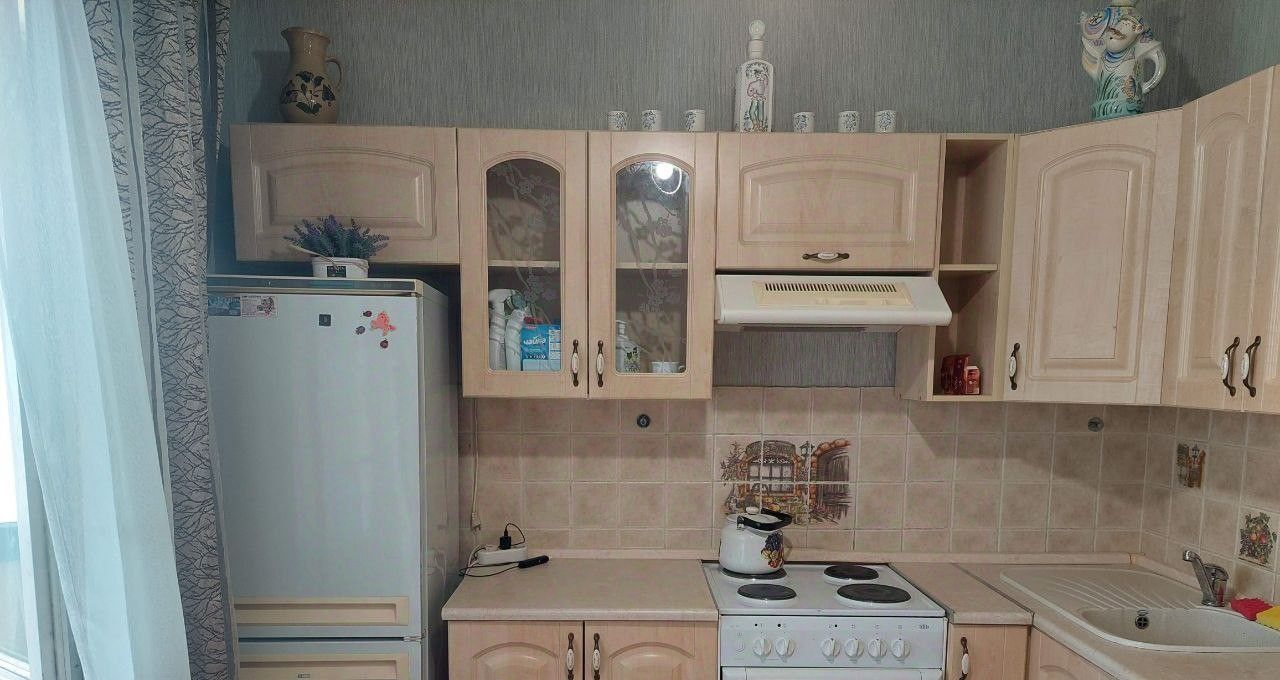 Вместительная кухня с современным кухонным гарнитуром, необходимой бытовой техникой. С кухни имеется выход на застеленную лоджию.