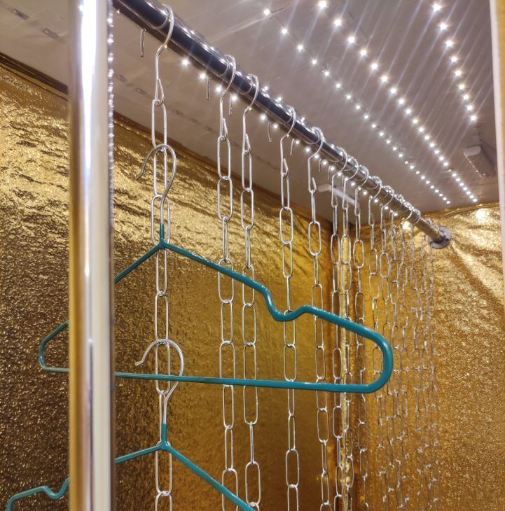 ширина - 170 см. В шкафу есть автоматическая подсветка, специальные вертикальные цепочки, позволяющие вешать вещи в несколько вертикальных уровней, что увеличивает вместительность во много раз. Вверху шкафа - огромная антресоль для хранения сезонных вещей.