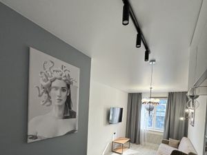 В мокрых зонах квартиры и возле элементов системы отопления установлены датчики протечек. Двери скрытого монтажа, молдинги, 3D-панели, стыки зон и комнат без порожков. Установлен сплит-кондиционер в соответствии со стандартами ЖК, а также проточный водонагреватель, исключающий дискомфорт во время планового отключения горячей воды. Продуманное комфортное освещение включает систему контражурной закарнизной подсветки. Уютная и функциональная кухня-гостиная, состоящая из столовой группы и диванной зоны, включает в себя кухонную мебель, сделанную на заказ, всю необходимую встроенную технику, а также фильтры для очистки воды.