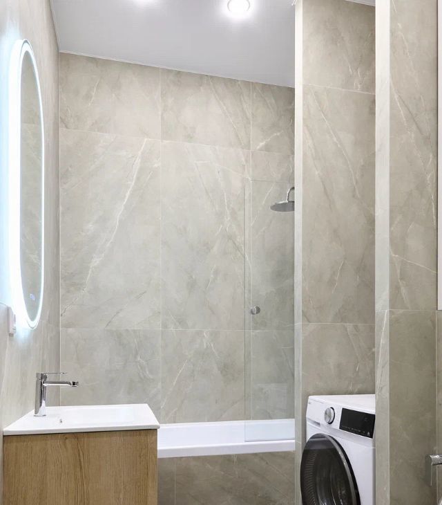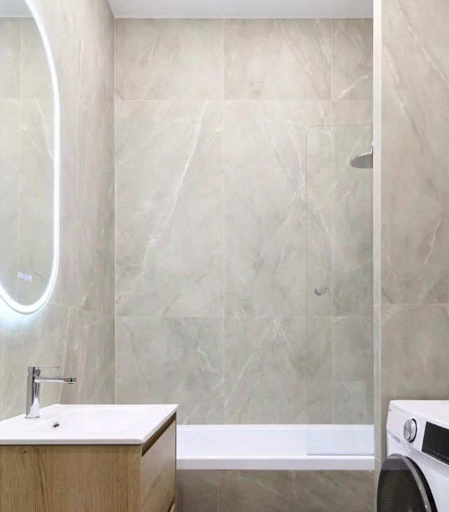 - просторная ванная комната в светлых тонах с качественной сантехникой от качественных брендов