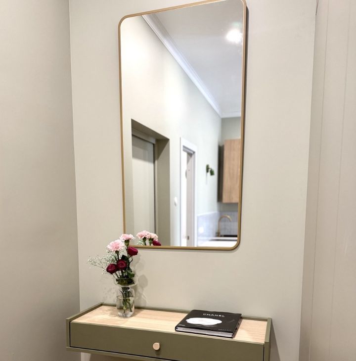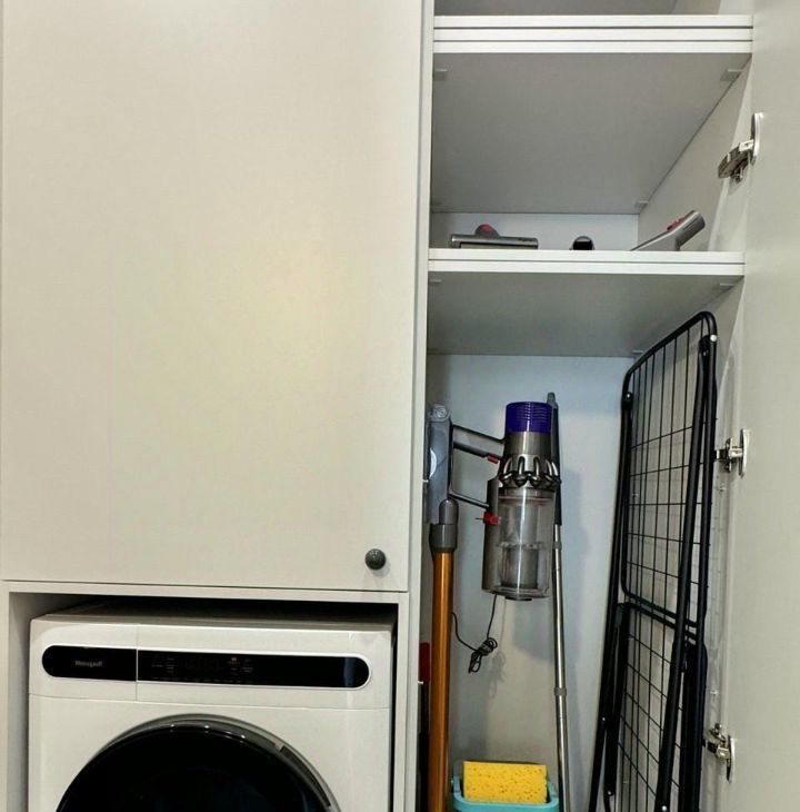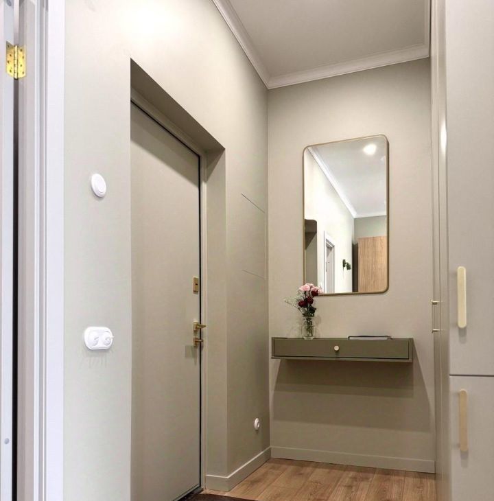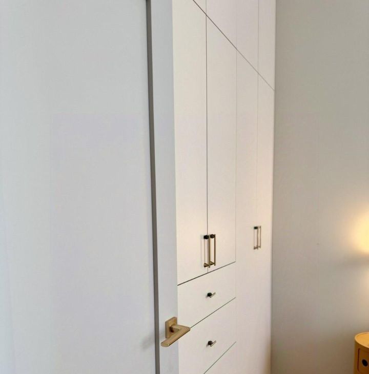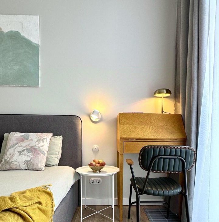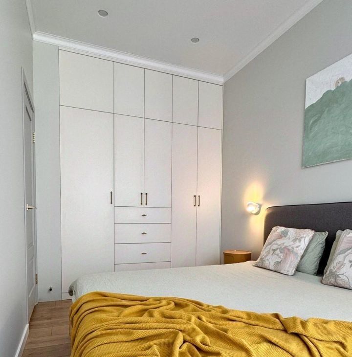 - Много мест хранения: просторный платяной шкаф в спальне, кровать с подъёмным механизмом, шкаф в прихожей.