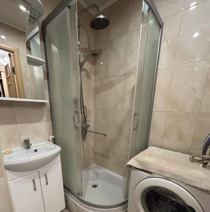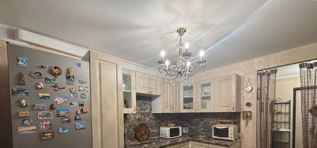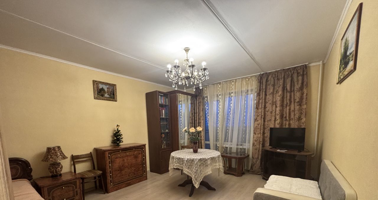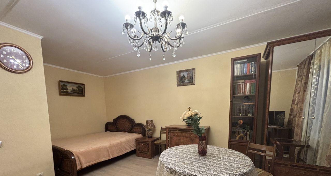 ОБЩАЯ ПЛОЩАДЬ 34,9 кв. м. + 3 кв. м. застекленный балкон. Комната 19,6 кв. м. с двуспальной кроватью, маленьким диваном, книжным шкафом, тумбой, двумя столами, комодом. Кухня 9 кв. м. с кухонной мебелью, электрической варочной поверхностью, микроволновой и духовой печками, холодильником. Санузел совместный в плитке, душевая кабина, стиральная машинка. В коридоре шкаф с вешалками. Высота потолков 2,64 см.