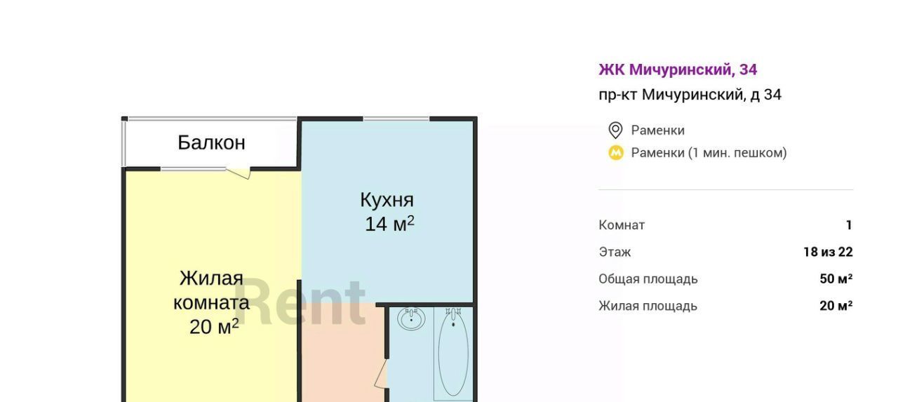1-к кв. Москва Мичуринский просп., 34 (50.0 м²)
