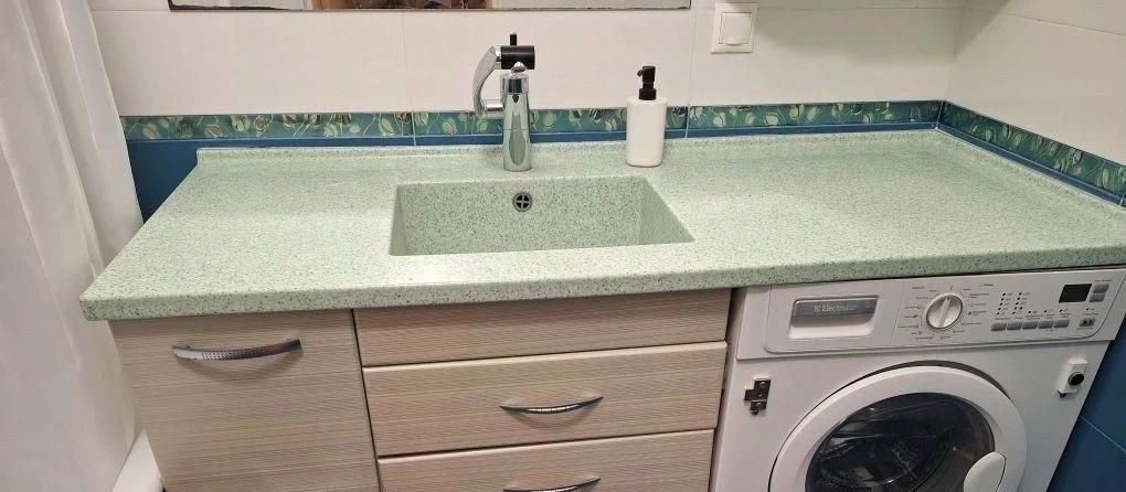 В комнате установлен кондиционер, а также имеется вместительный шкаф для хранения вещей. Из мебели — удобная кровать и стол. На кухне установлена современная бытовая техника, включая холодильник, посудомойку и микроволновую печь. Также есть стиральная машина.
