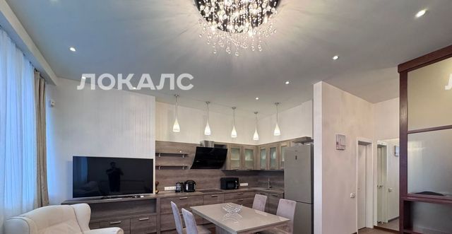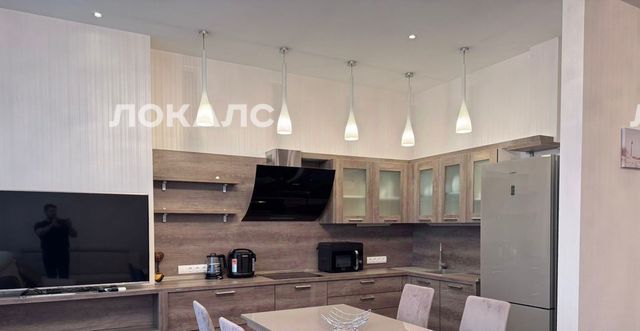 Просторная кухня-гостиная укомплектована всей необходимой мебелью и бытовой техникой - посудомоечная машина, холодильник, СВЧ печь, мультиварка, стекло-керамическая плита, чайник, телевизор.