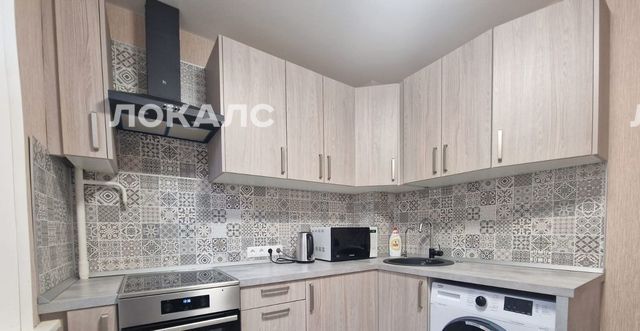 * **Кухня (8 кв.м) оснащена встроенной мебелью с индукционной плитой и духовкой, вытяжкой, микроволновкой, холодильником, стиральной машиной, обеденным столом и стульями . В комнате 16,8 кв.м есть: 2-х спальный диван, 2 вместительных комода, 3-х створчатый шкаф. Около окна рабочее место. Вся мебель современная и функциональная.