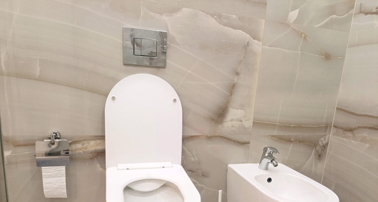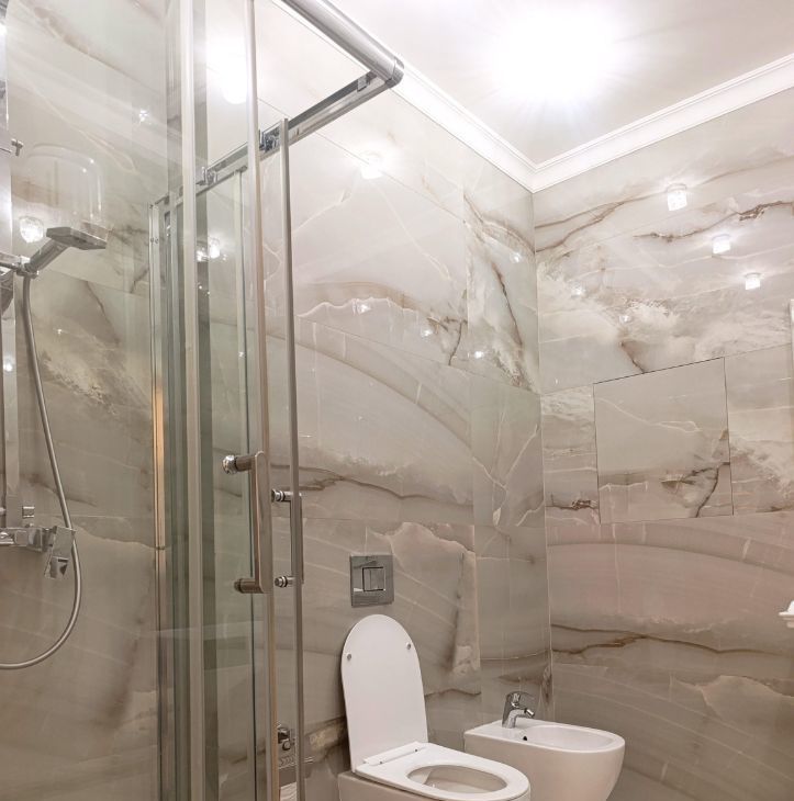 Просторная ванная комната с душем и биде .