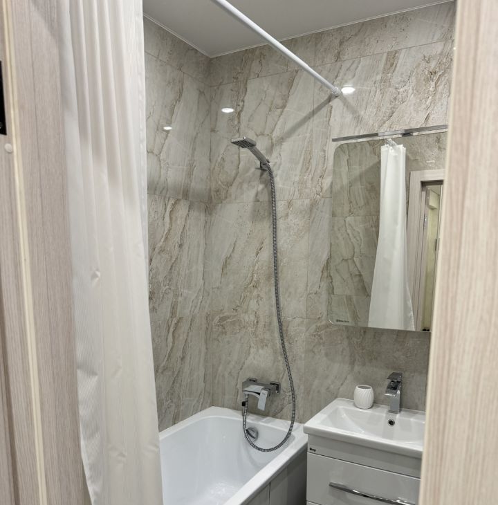 Сдается отличная теплая квартира с новым ремонтом. В квартире теплые полы, дизайнерское освещение, вместительная гардеробная, большой балкон, а также все необходимое для комфортного проживания: удобная мебель, техника (холодильник, микроволновая печь, индукционная плита, электрический духовой шкаф, стиральная машина, кондиционер, телевизор, утюг и т.д), посуда.