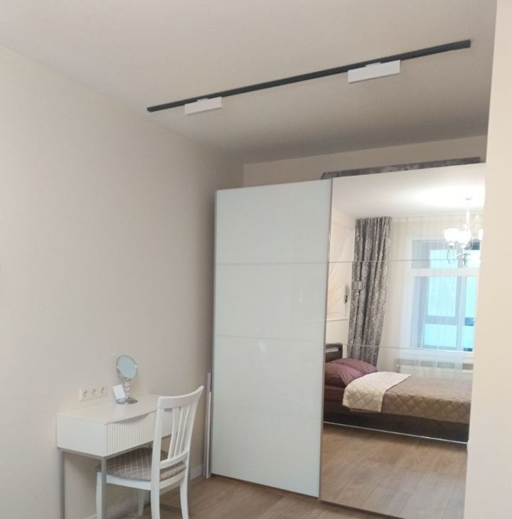 Широкая двуспальная кровать (160 см) с ортопедическим матрасом — центральный элемент спальни, обеспечивающий комфорт для двоих, есть постельные принадлежности, в спальне имеется зона с туалетным столиком, вместительный шкаф.