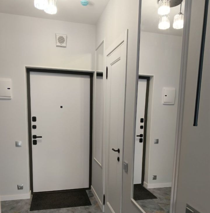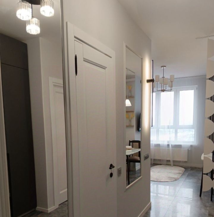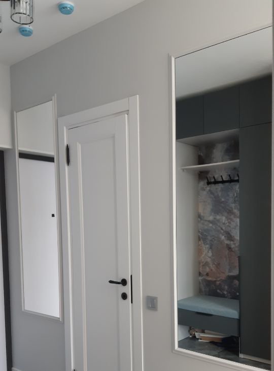 В прихожей есть встроенный шкаф с банкеткой, настенные зеркала позволяют видеть себя в полный рост.