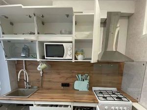Квартира с новым ремонтом. Есть всё необходимое: стиральная машина, утюг, кухонный гарнитур, встроенный холодильник, духовка, плита, двуспальная кровать с вместительным поддоном, огромный шкаф (который отгораживает кровать) и многое другое.