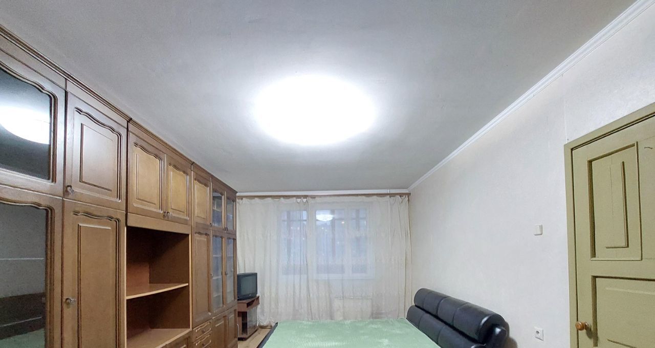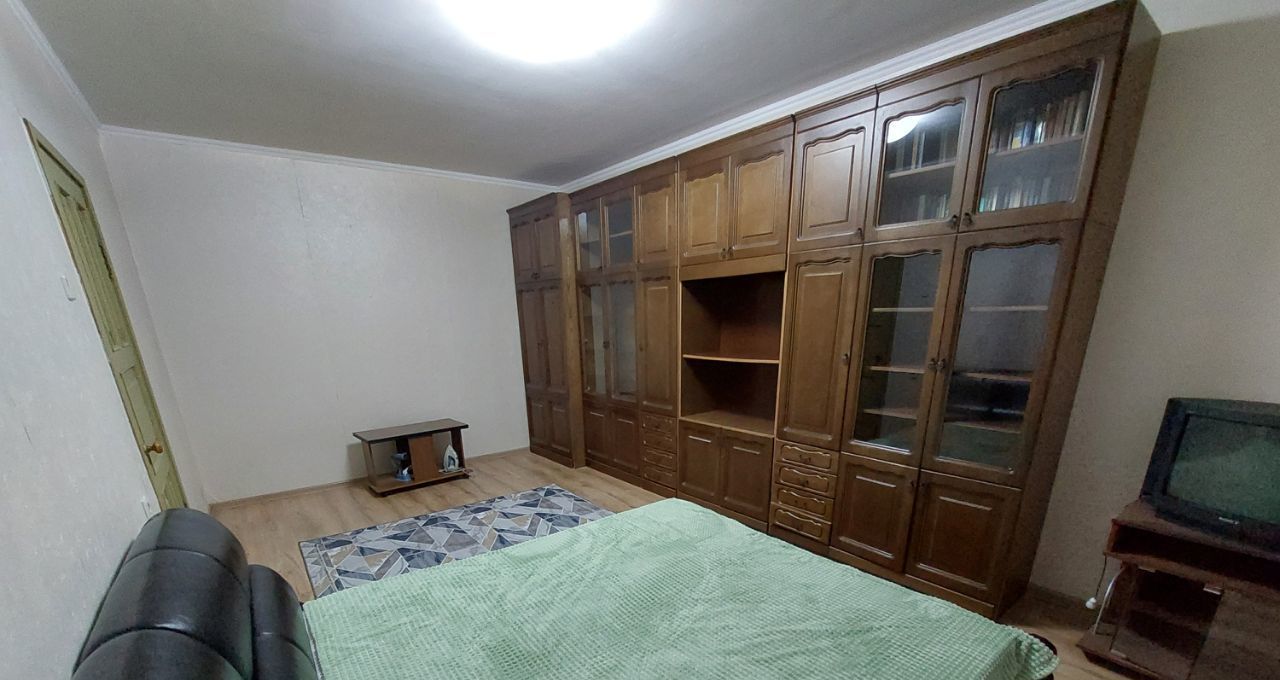 В комнате 19 м2- стенка в хорошем состоянии, импортная 2-х спальная кровать, журнальный стол, ТВ.