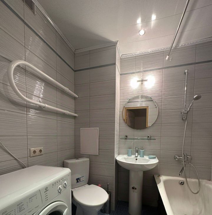 С/у совмещен, отделан по ЕВРОСТАНДАРТУ- современной плиткой до потолка, подвесной потолок, новая стиральная машина-автомат. на 6 кг.