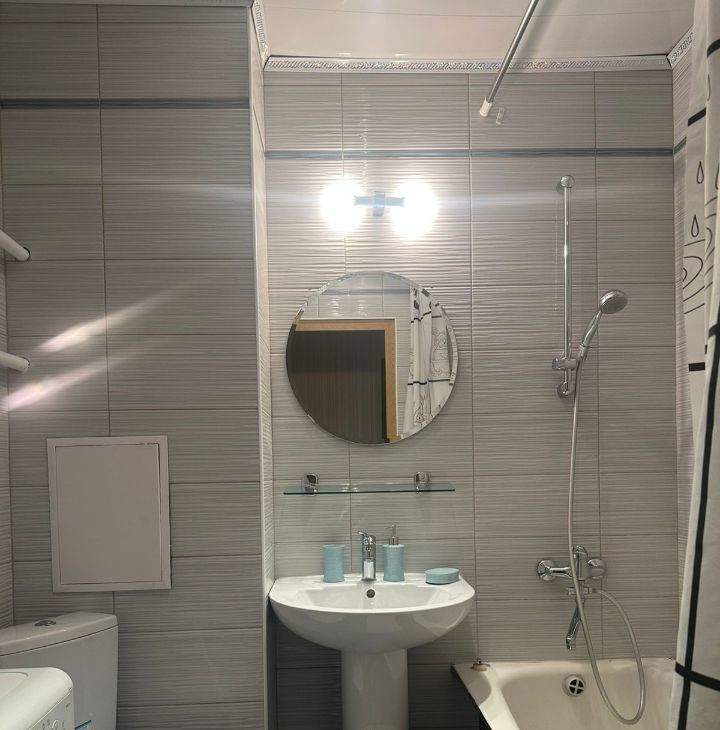 * С/у совмещен, отделан по ЕВРОСТАНДАРТУ- современной плиткой до потолка, подвесной потолок, стиральная машина-автомат на 6 кг.