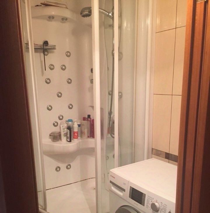 Санузел оборудован душевой кабиной, широкой раковиной, зеркалом с подсветкой и стиральной машиной. Балкон утеплён и оснащён системой тёплых полов — можно использовать как кабинет или зону отдыха.