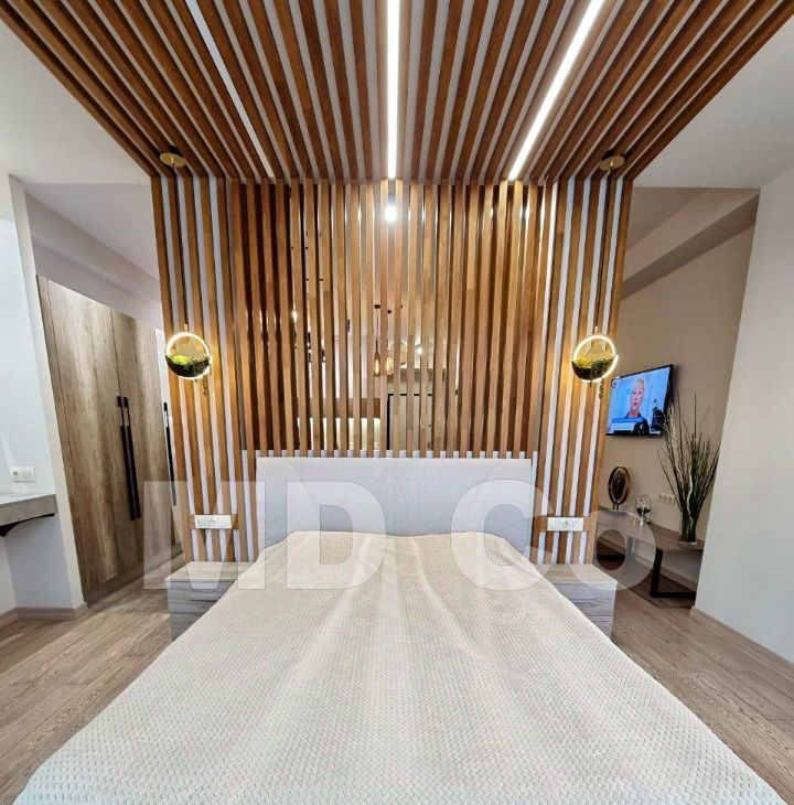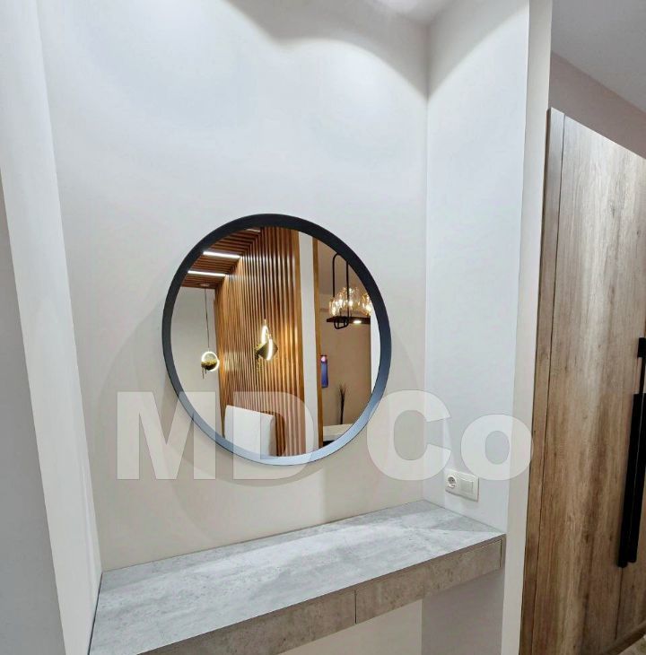 Квартира укомплектована абсолютно всем для комфортного проживания вся бытовая техника и мебель в наличии в отличном состоянии. Отдельная гардеробная комната. Огромная кухня-гостиная с комбинацией из глянцевых и матовых фасадов, выездными колонами, встроенной техникой (стиральная машина, посудомоечная машина, индукционная плита, микроволновая печь, духовой шкаф, холодильник, вытяжка), барной стойкой. Спальня отделена от зала стеной с просветом из реек, внутри спальни расположено полноценное рабочее место с письменным столом и креслом. Совмещённый санузел, с душевой кабиной. ЖК-Телевизор. Интернет. Домофон.
