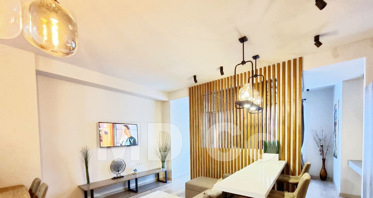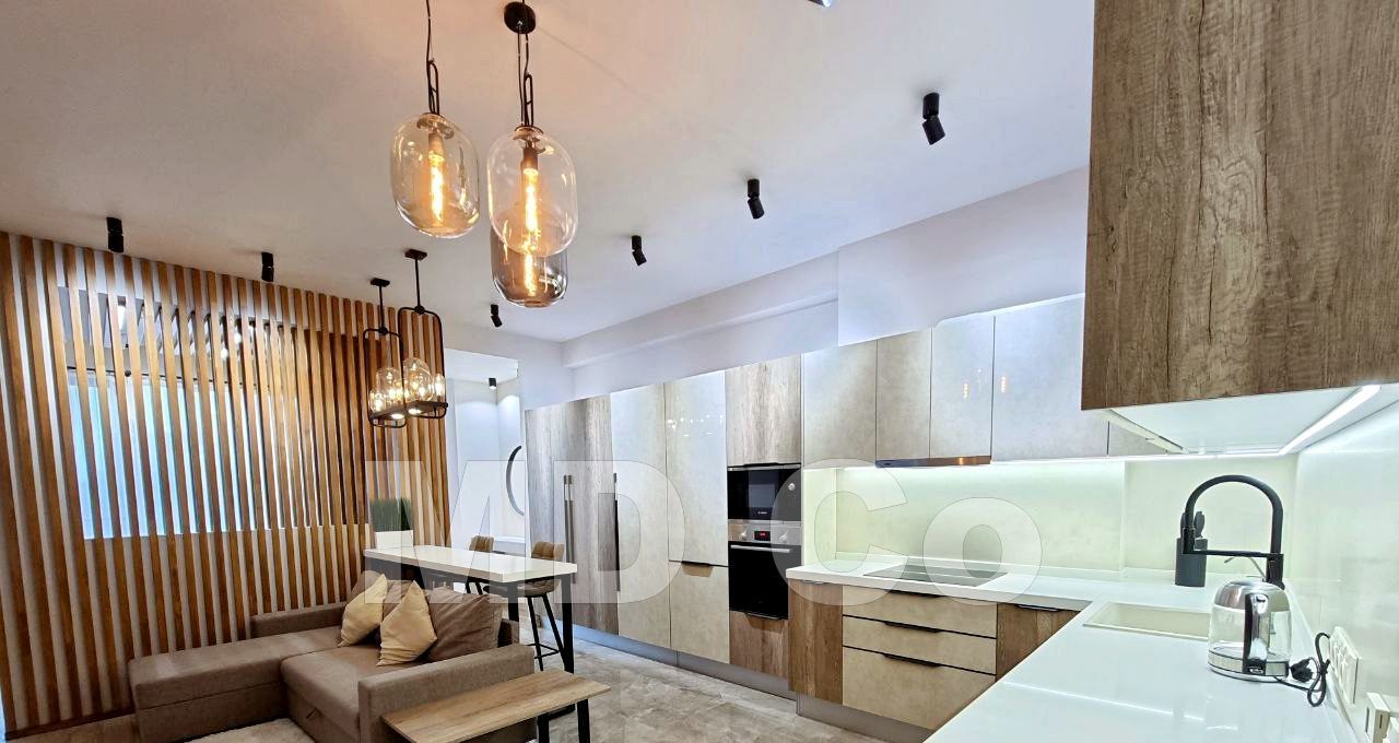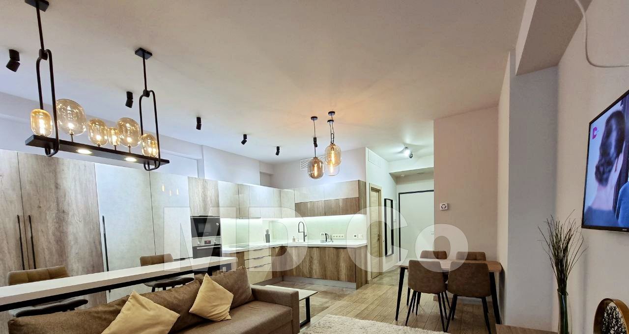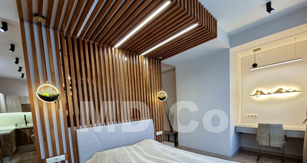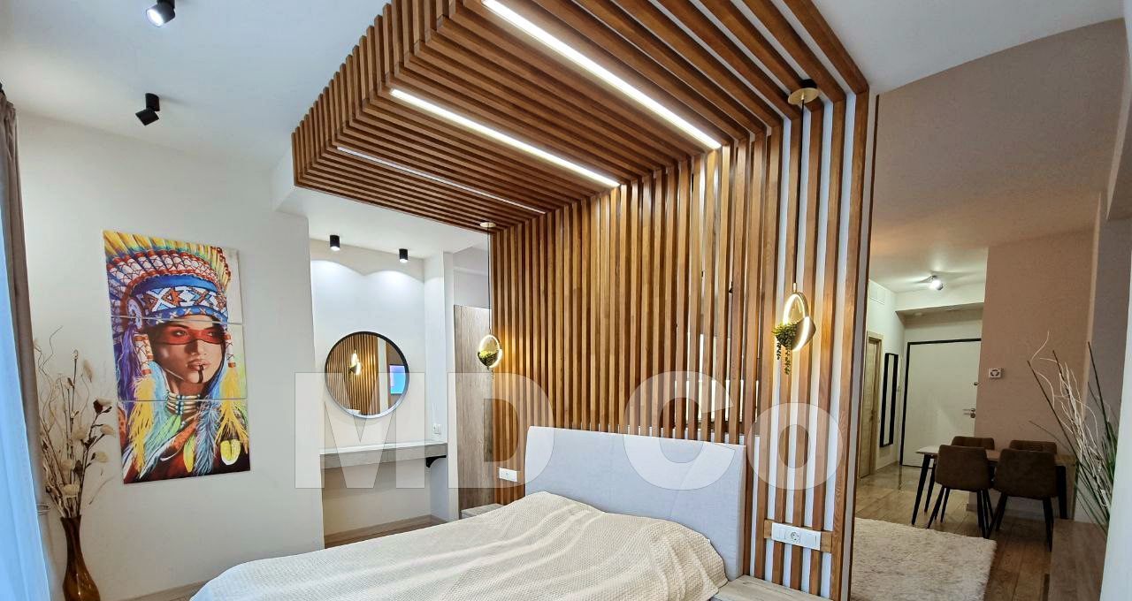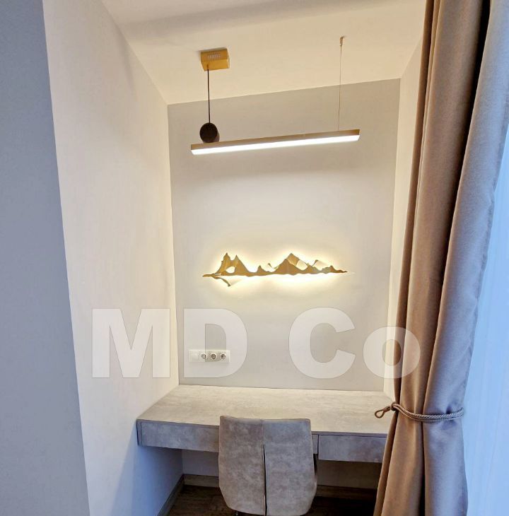 Квартира укомплектована абсолютно всем для комфортного проживания вся бытовая техника и мебель в наличии в отличном состоянии. Отдельная гардеробная комната. Огромная кухня-гостиная с комбинацией из глянцевых и матовых фасадов, выездными колонами, встроенной техникой (стиральная машина, посудомоечная машина, индукционная плита, микроволновая печь, духовой шкаф, холодильник, вытяжка), барной стойкой. Спальня отделена от зала стеной с просветом из реек, внутри спальни расположено полноценное рабочее место с письменным столом и креслом. Совмещённый санузел, с душевой кабиной. ЖК-Телевизор. Интернет. Домофон.