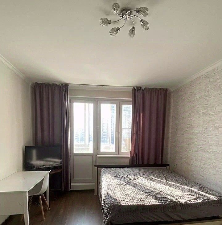 В комнате установлена современная мебель: кровать, письменный стол и стулья. Окна выходят на тихий двор, обеспечивая спокойствие и свет. В квартире есть лоджия, где можно наслаждаться свежим воздухом.