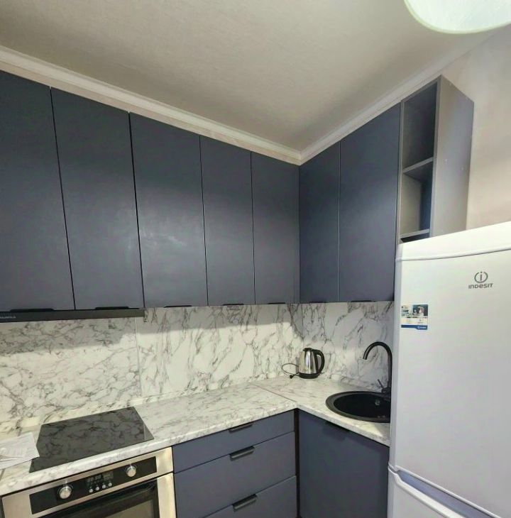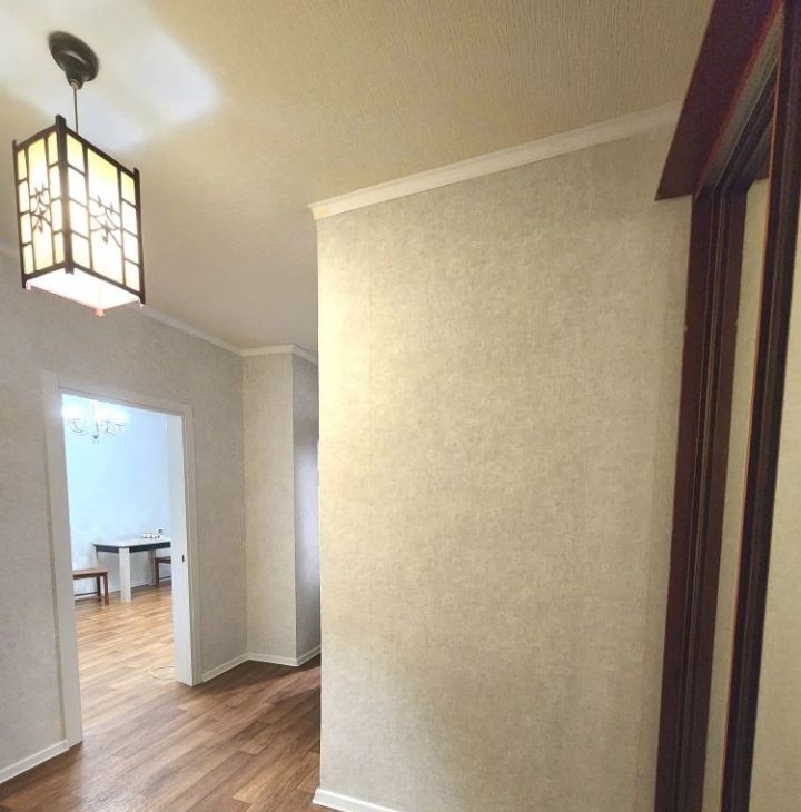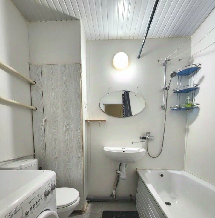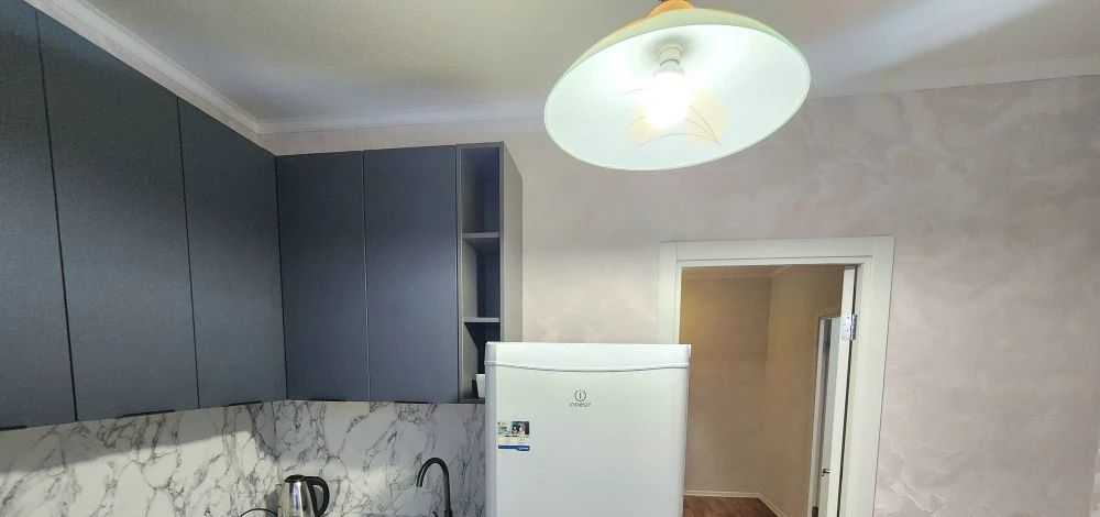 В квартире сделан свежий косметический ремонт. Просторная жилая зона площадью 19 кв. м с окнами, выходящими во двор, обеспечит вам тишину и комфорт. Кухня площадью 8 кв. м оборудована всей необходимой мебелью и техникой, включая холодильник и стиральную машину. Санузел совмещенный, с ванной. Для вашего удобства в доме есть пассажирский и грузовой лифты.