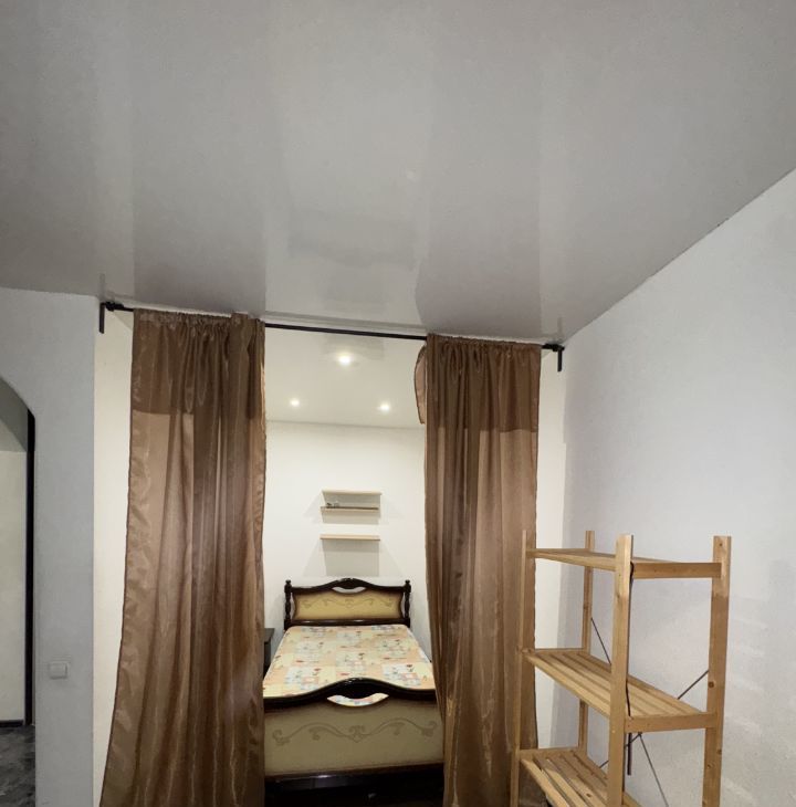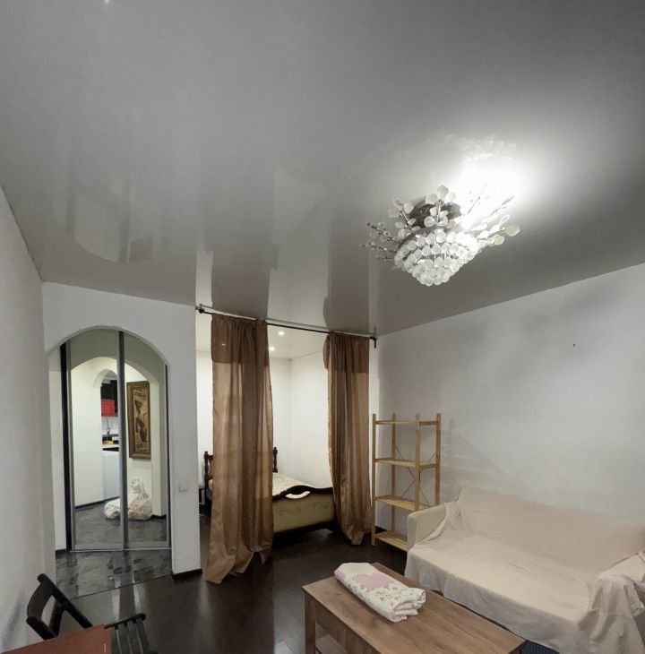 Мебель: обеденный стол со стульями, письменный стол, двуспальный диван, двуспальная кровать (между ними разделены зоны шторами), вместительный шкаф для вещей.