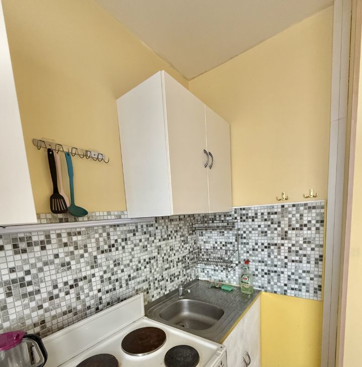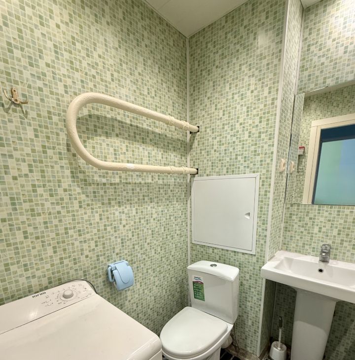 В квартире есть всё для жизни — кондиционер, холодильник, стиральная машина, мебель в комнате и на кухне.