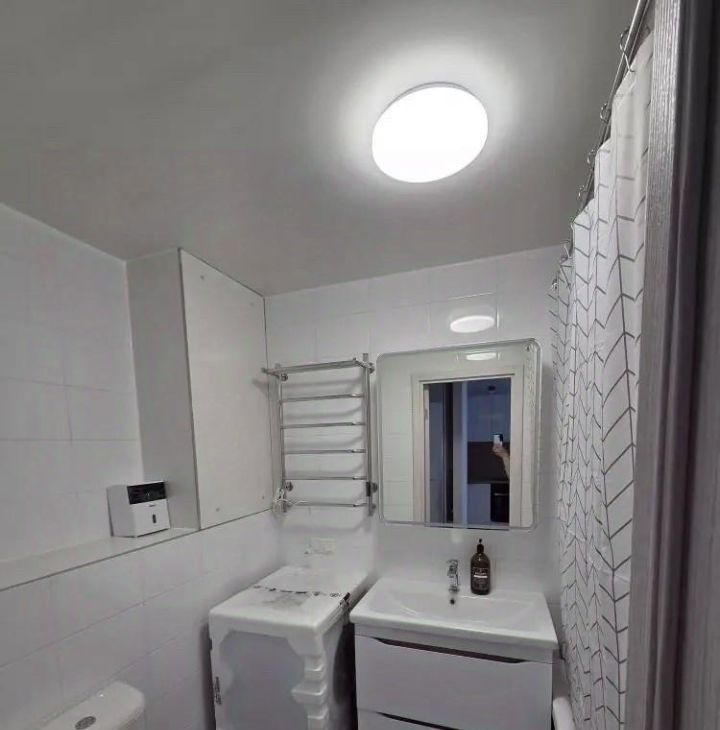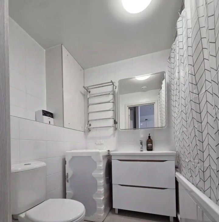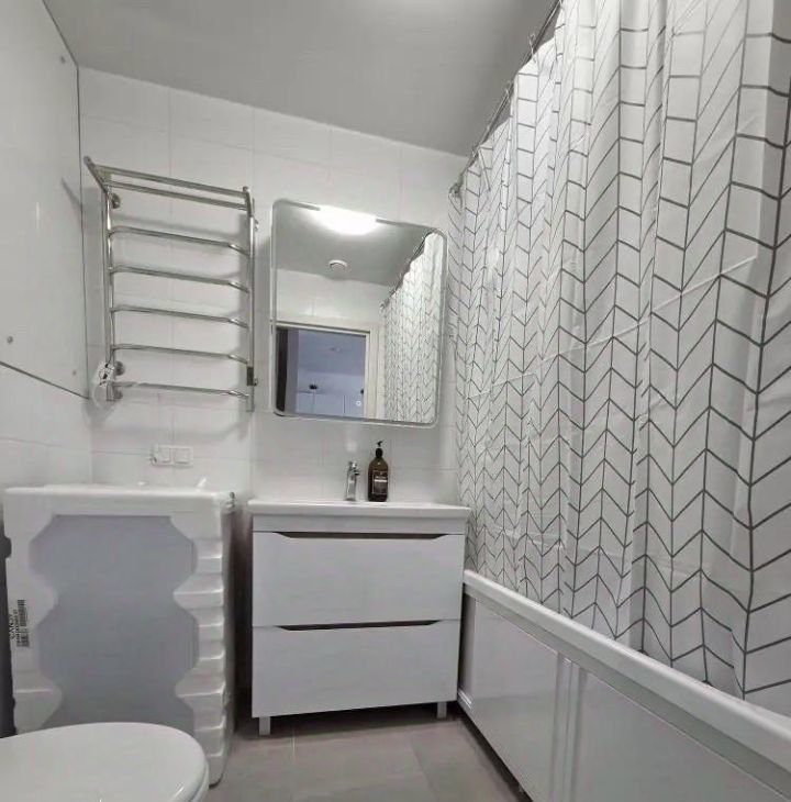Санузел: стиральная машина, широкая и удобная тумба с раковиной, шкафчик с зеркалом и подсветкой, полотенцесушитель электрический и бойлер 30л (водонагреватель) на случай отключения горячей воды.