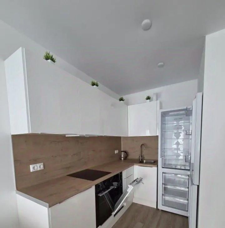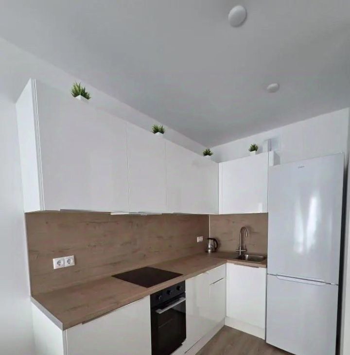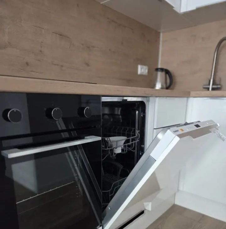 Кухня-гостиная: новый стильный кухонный гарнитур, холодильник, варочная индукционная панель, духовой шкаф с широким функционалом, посудомоечная машина, электрочайник, вытяжка, , телевизор с голосовым помощником Алиса, стол, стулья, диван-кровать (140х198)с ящиком для белья, вместительный комод-тумба под тв, сушилка для белья.