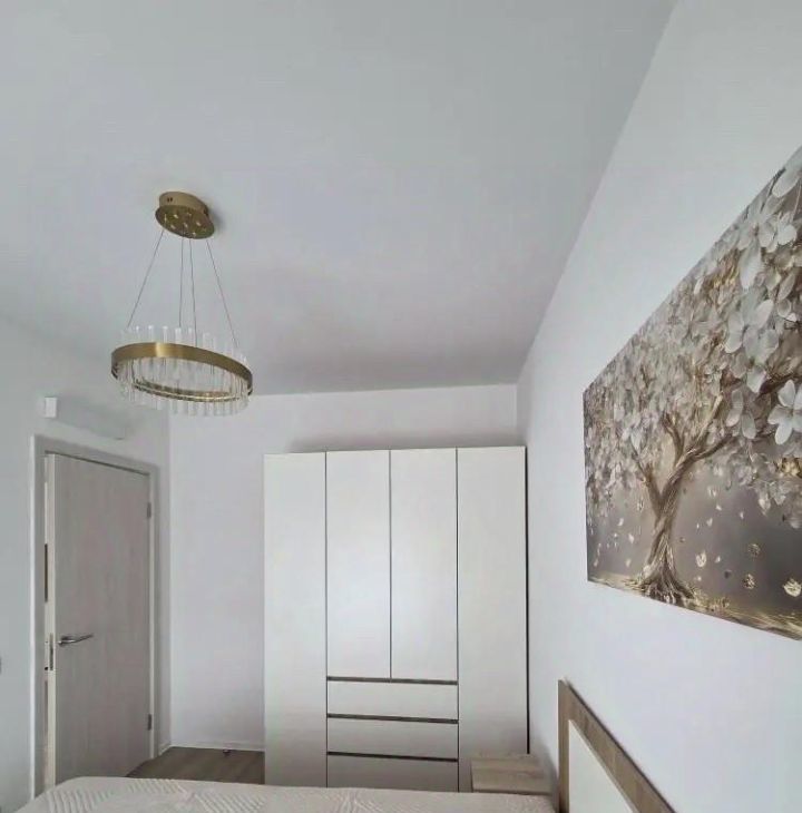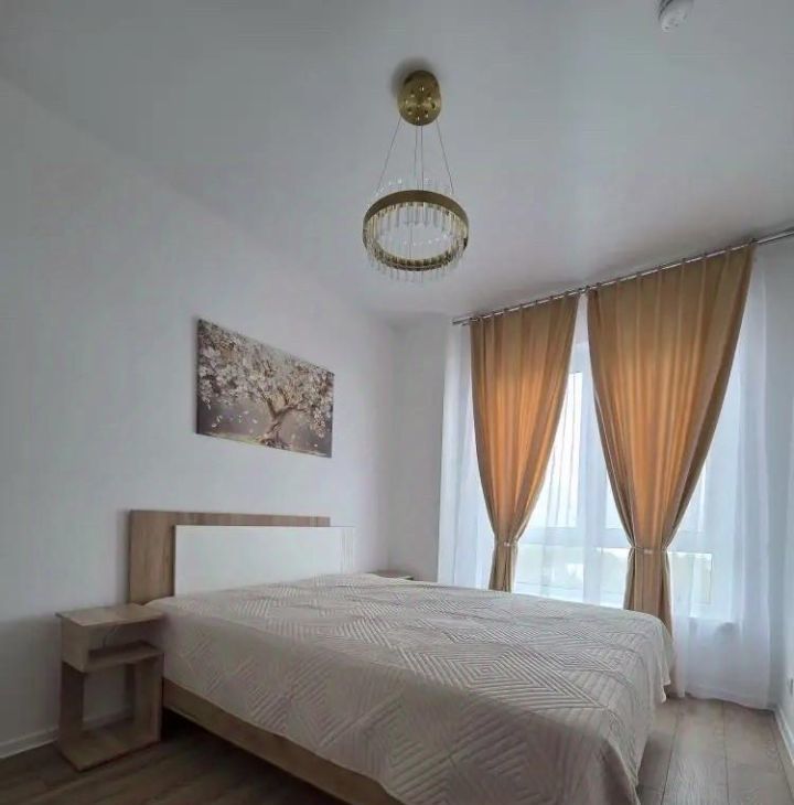 Спальня: кровать 160х200 с подъемным механизмом (место для хранения), вместительный шкаф, дизайнерская люстра.