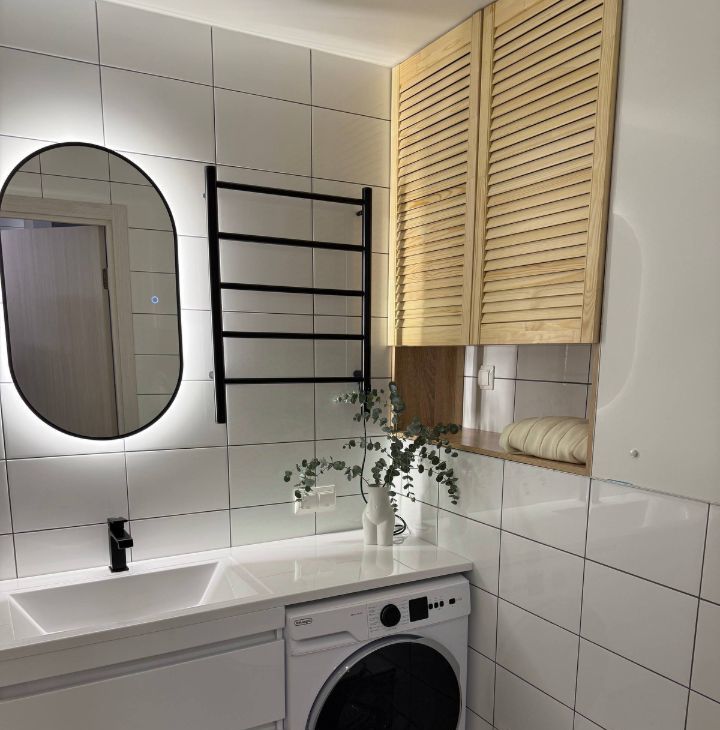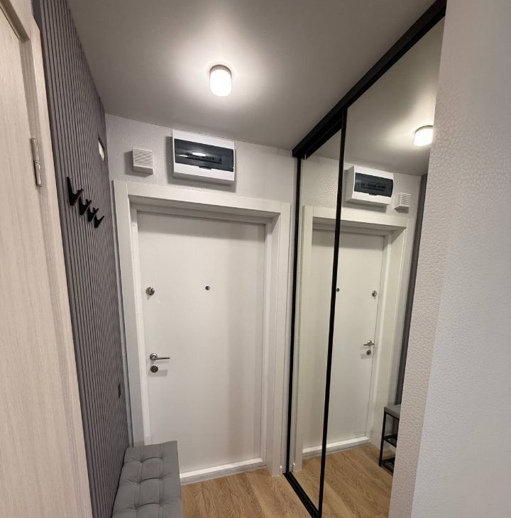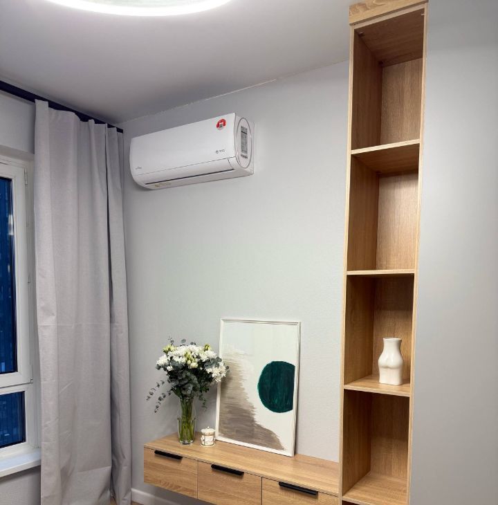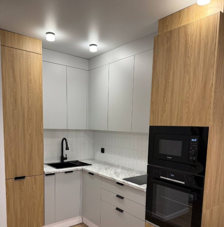 Установлен кондиционер, ПММ Indesit, встроенный холодильник No Frost, встроенная духовка и СВЧ Weissgauff. Корпусная мебель Вереск.