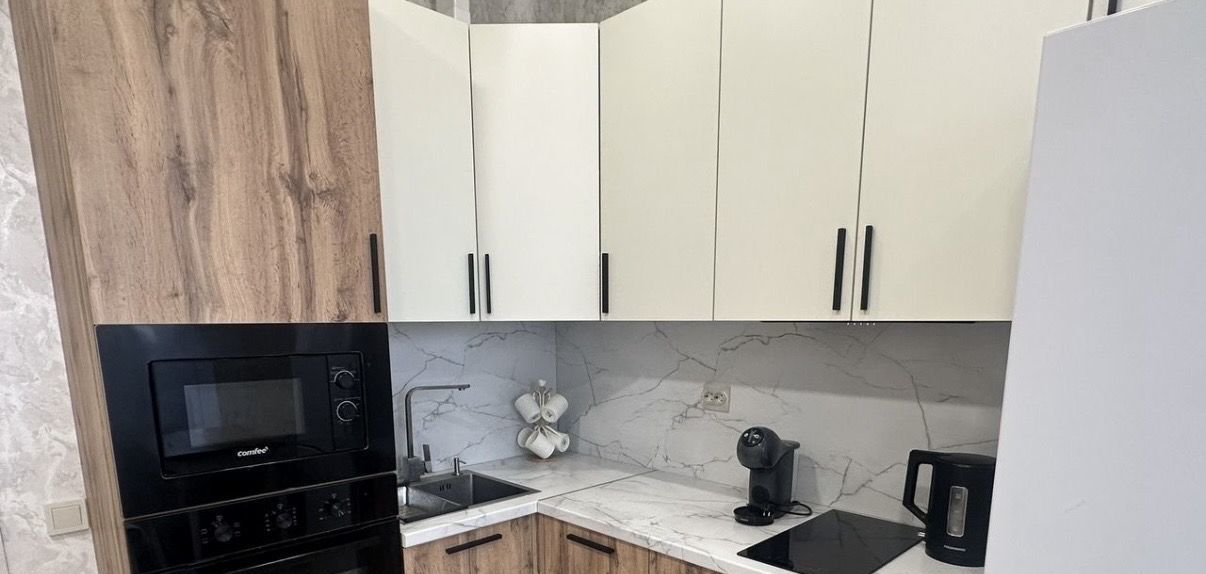Кухня оборудована всей необходимой встроенной техникой, включая посудомоечную машину. Есть раскладной диван.