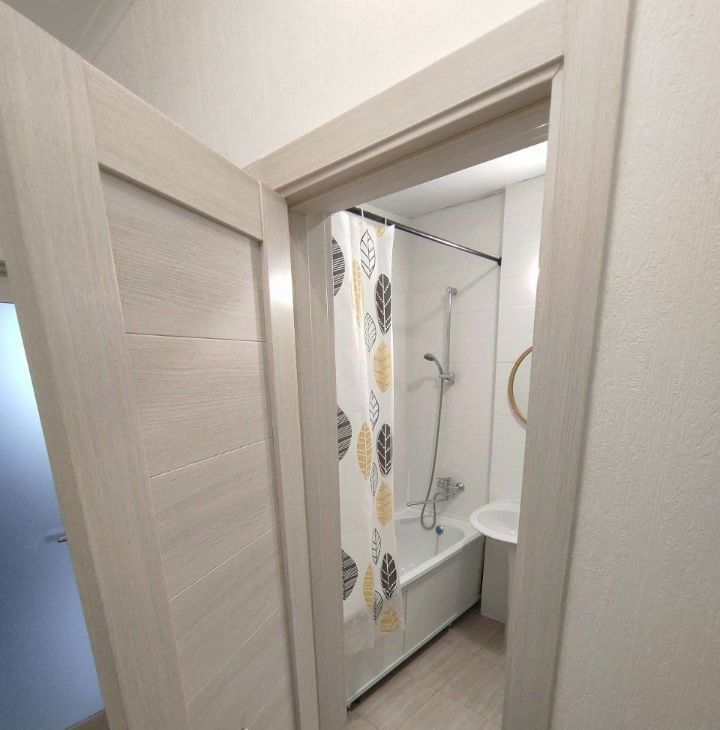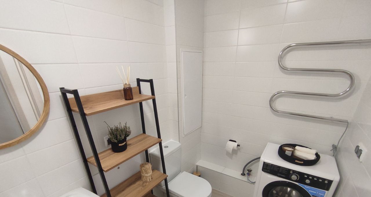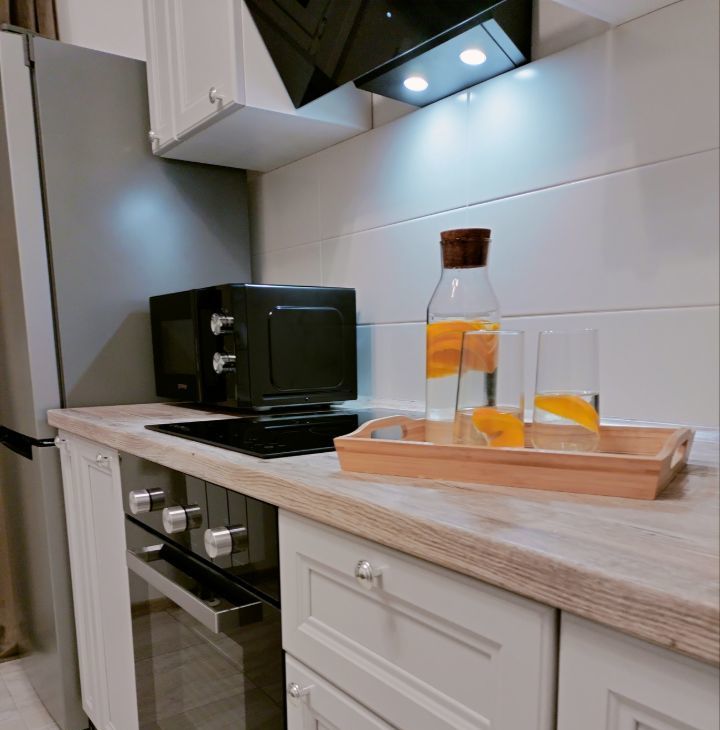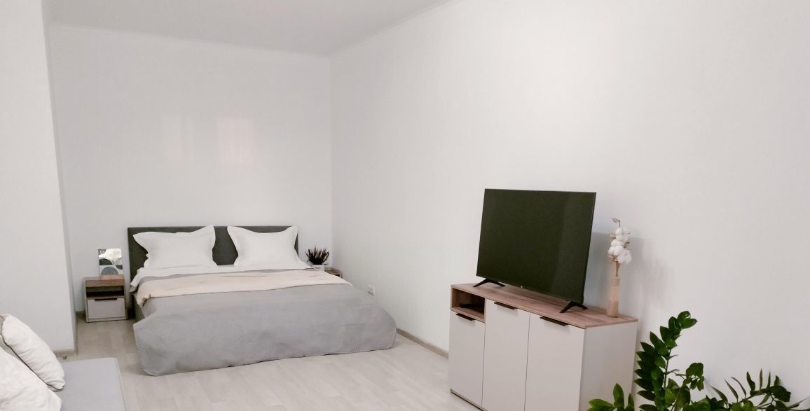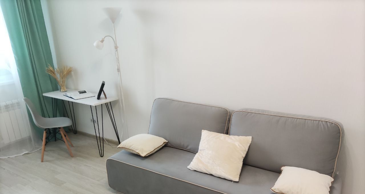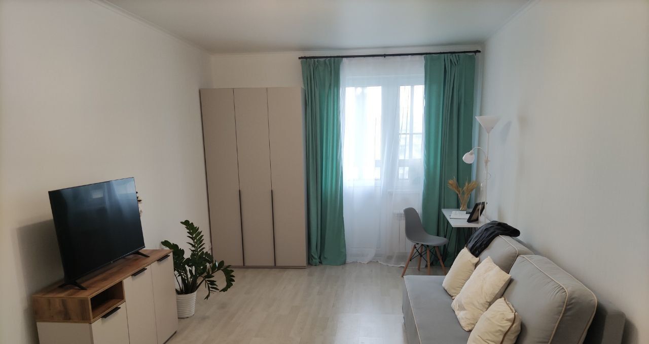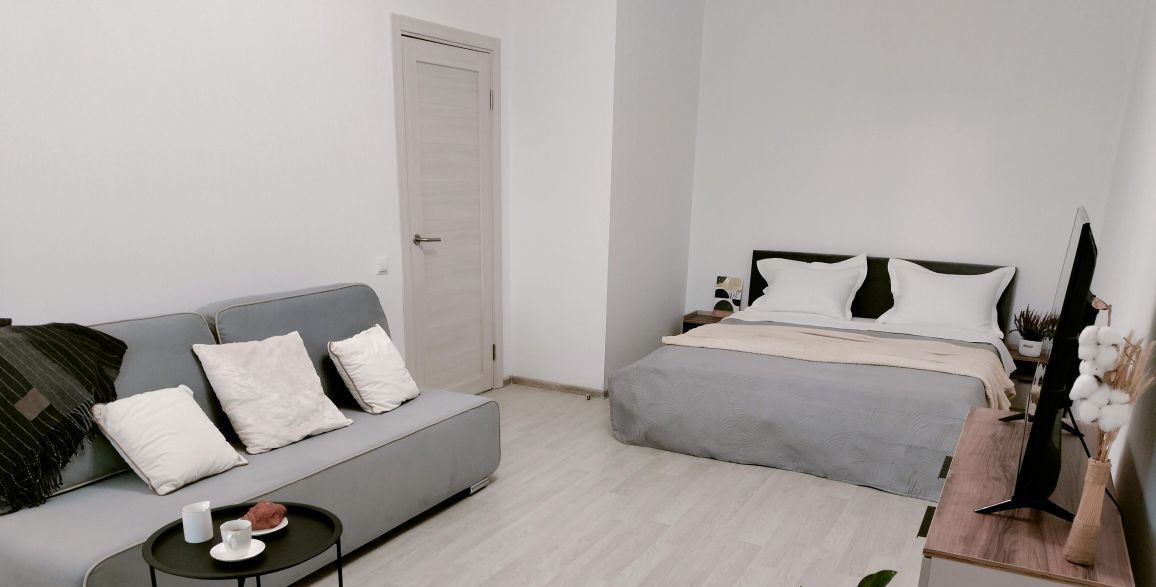 В квартире удобная планировка: в просторной комнате двуспальная кровать, раскладной диван, телевизор со Smart TV, рабочая зона, а также балкон, окна выходят на запад вечером вас ждут красивые закаты. Кухня оборудована новой бытовой техникой: холодильник, микроволновая печь, духовка, варочная поверхность, вытяжка, чайник; совмещённый санузел со стиральной машиной; коридор с вместительным шкафом купе.