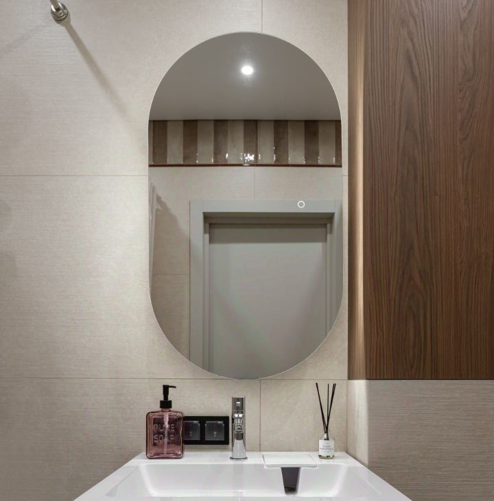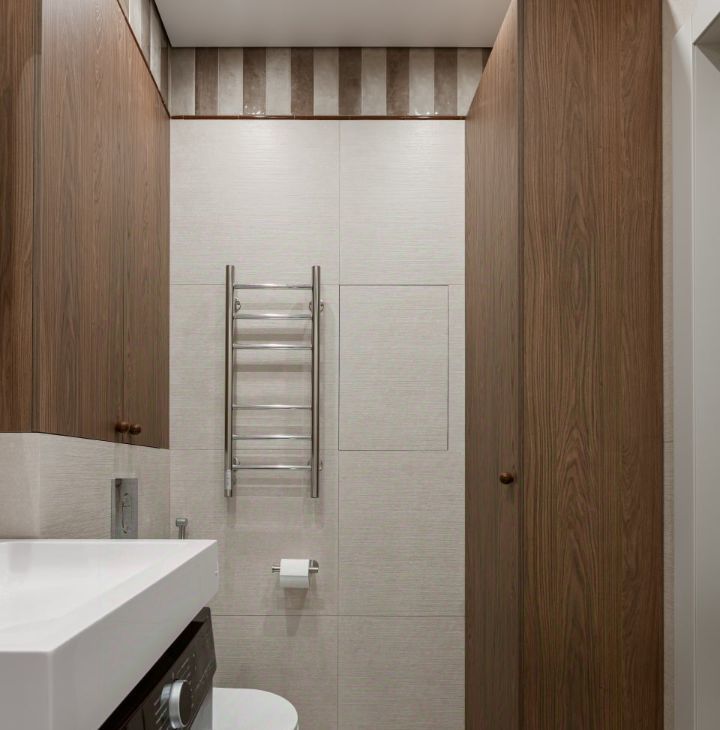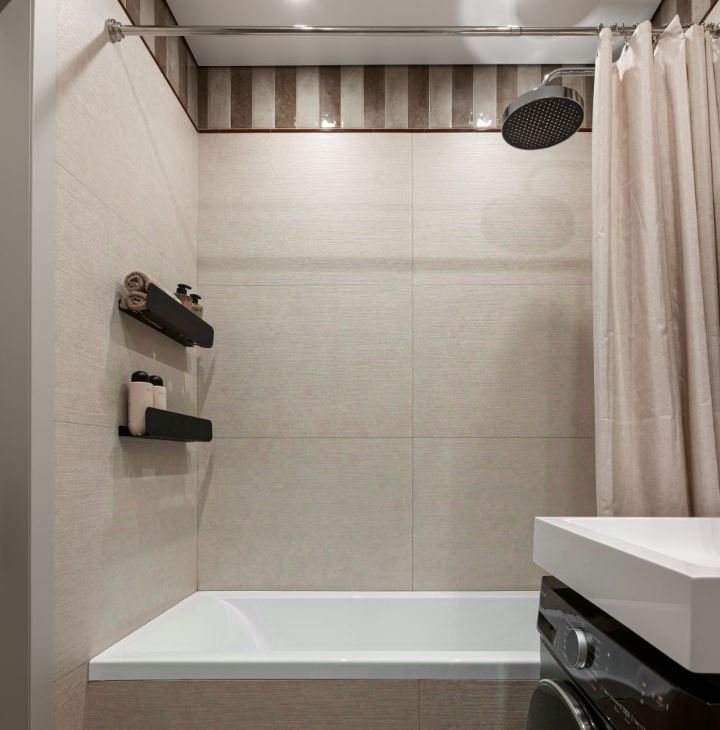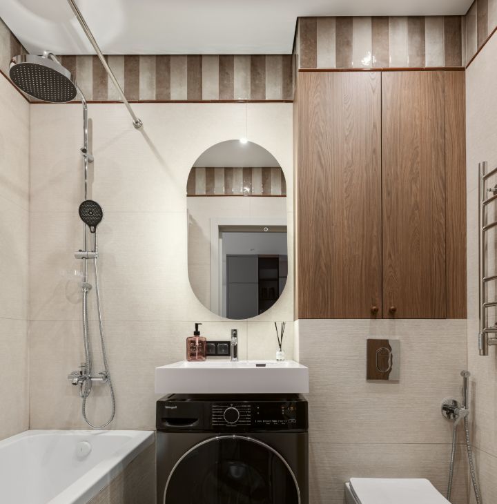 Ванная комната с полноценной ванной, стиральной машиной с функцией сушки и всеми необходимыми аксессуарами и местом для хранения. Подключен водонагреватель, есть теплые полы, установлены датчики протечки и аква стоп.