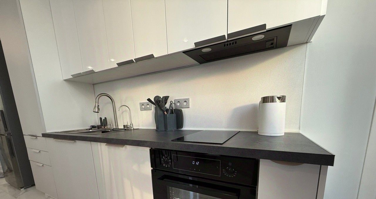 Кухня оборудована всей необходимой техникой: холодильник, варочная панель, микроволновка, духовой шкаф, посудомойка, вытяжка.