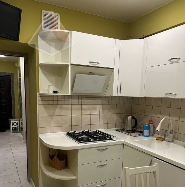 Техника: холодильник, плита, духовка, стиральная машина, ТВ, интернет; мебель на кухне и в комнате.