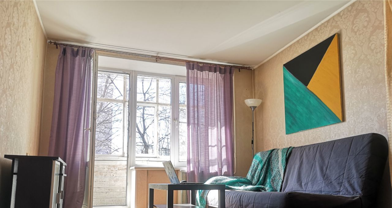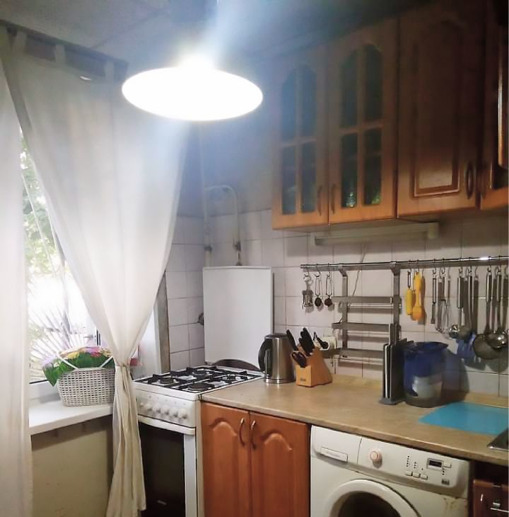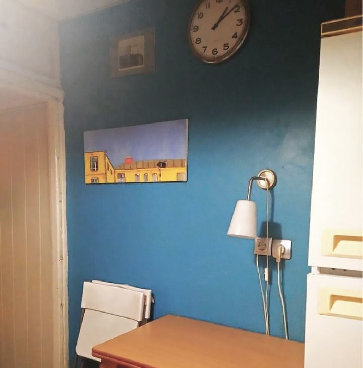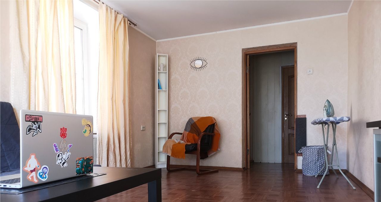 Дом построен на пригорке, поэтому с одной стороны он пятиэтажный, а со стороны двора — шестиэтажный. Из-за этого вход в квартиру, спальня, туалет, кухня находятся на первом этаже, а большая светлая гостиная — на втором этаже с балконом и видом на тихий двор. Дом был построен в 1964 году при участии моего деда, работавшего на советской автобазе водителем.
