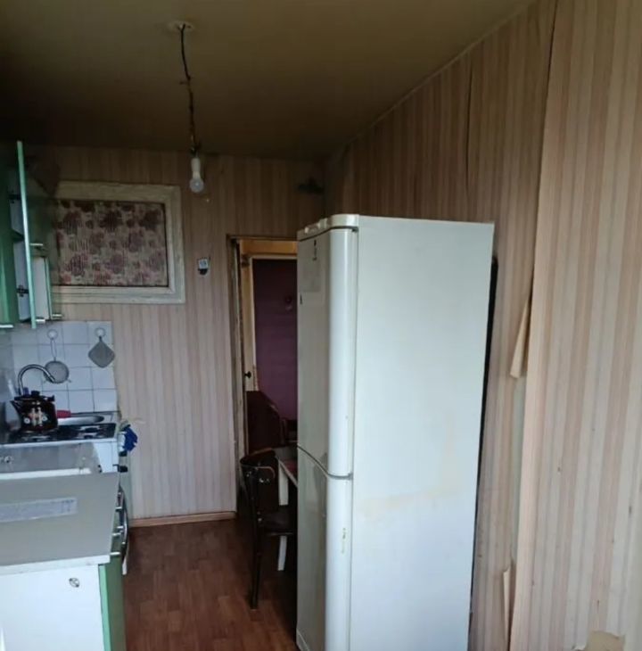 Кирпичный дом. Балкон застеклен. Стенка, диван, кровать, кухонный гарнитур, холодильник, стиральная машина.