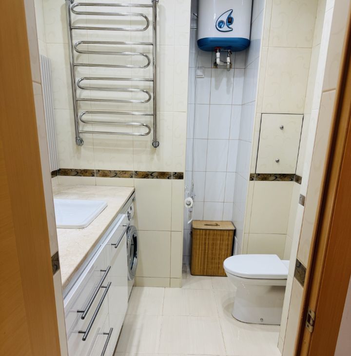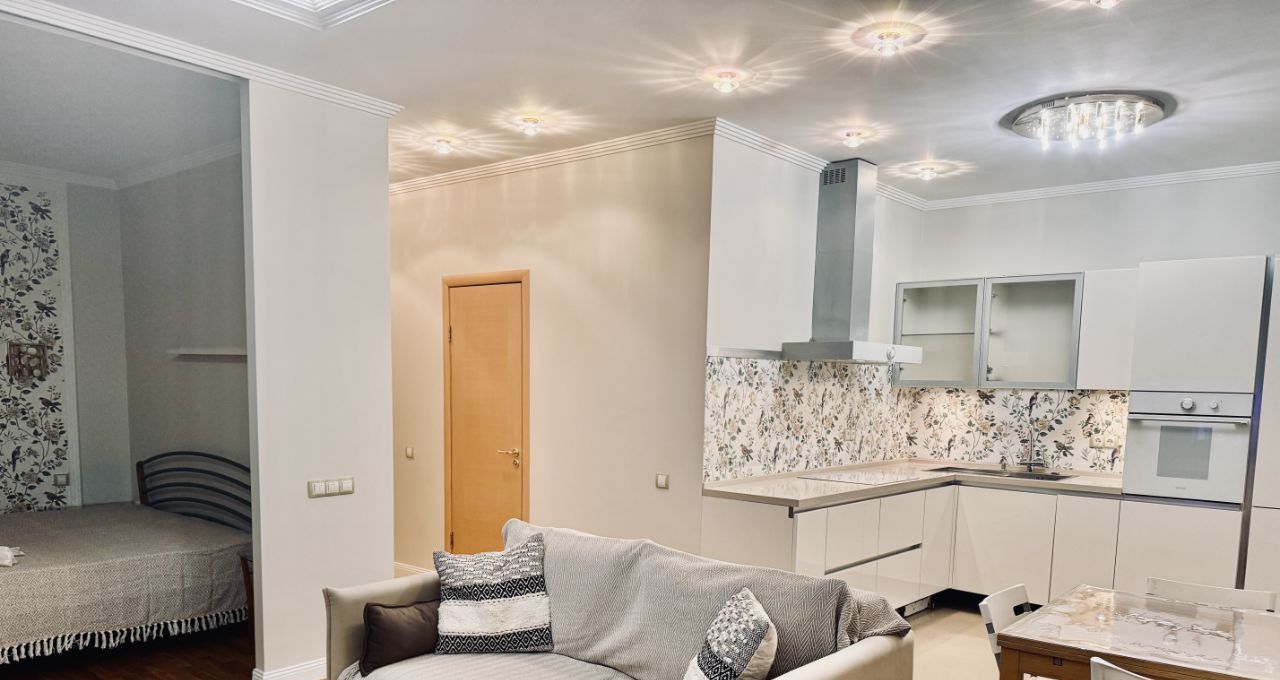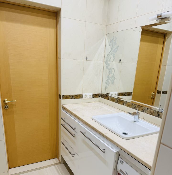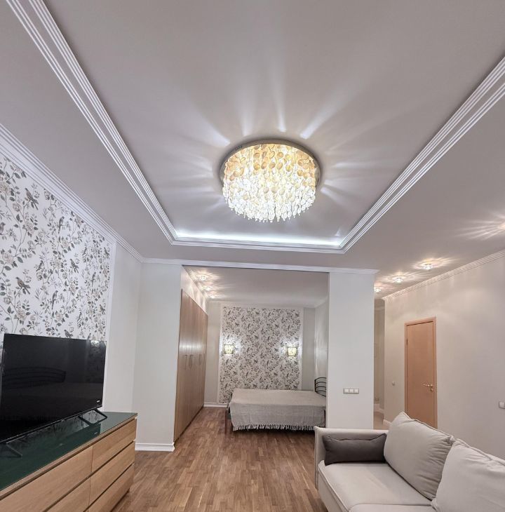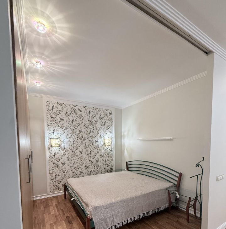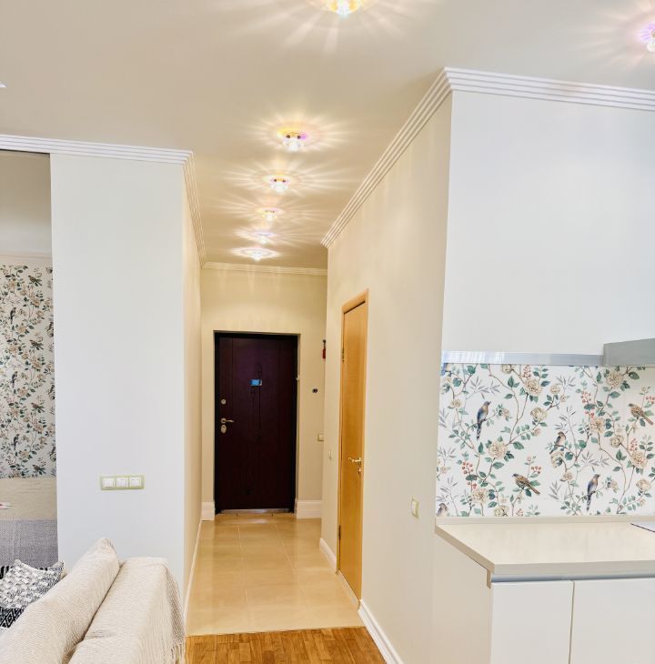 Квартира с евроремонтом оборудована всем необходимым для комфортного проживания. В комнате и на кухне есть мебель. Имеется гардеробная. Из техники: кондиционер, холодильник, посудомоечная и стиральная машины, а также телевизор. Ванная комната оснащена душевой кабиной. Окна выходят во двор, поэтому в квартире тихо и спокойно. Есть лоджия, где можно наслаждаться свежим воздухом.